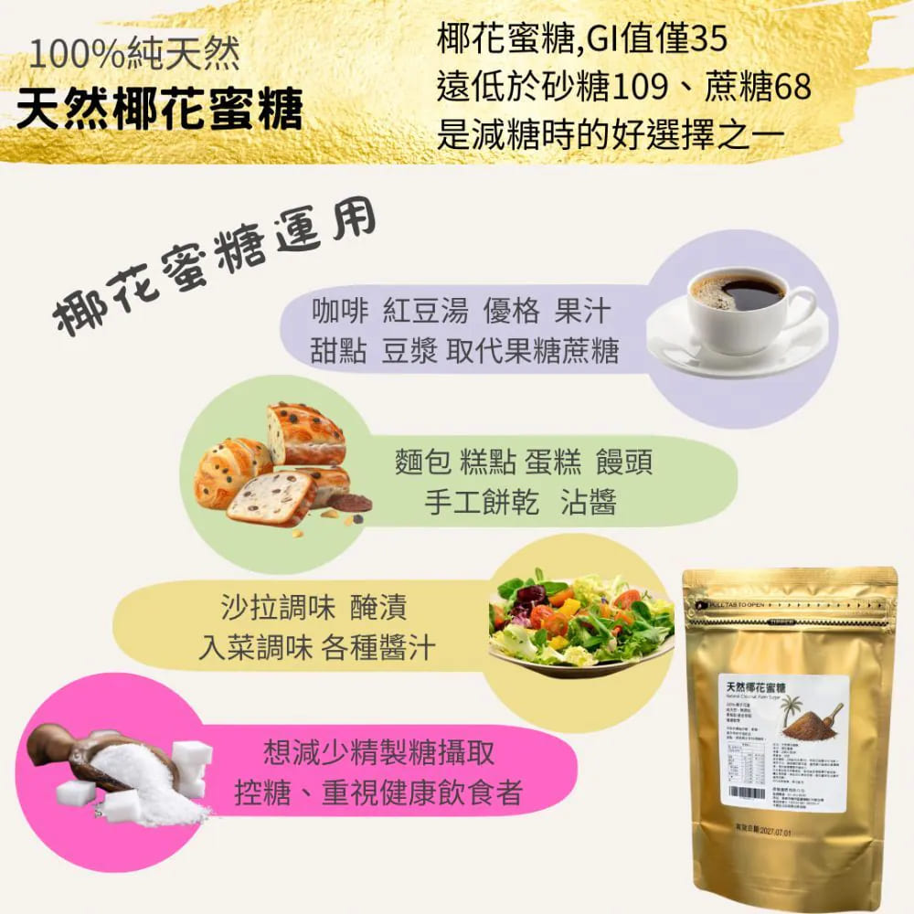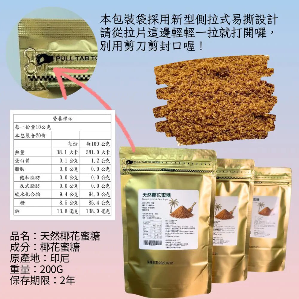 你還在用白砂糖嗎?那你真的該試試這個 ——椰花蜜糖!-這款是來自印尼的天然椰子花蜜,100%純天然、沒有精製、也沒有添加化學東西!甜得很溫和,完全不膩,還帶一點淡淡椰子香,超療癒~-☑ 礦物質跟B群通通保留下來,營養加分!☑ 沖咖啡、泡茶、煮甜湯都超搭,☑ 做烘焙、甜點也可以直接用,比黑糖還細緻、層次更多!-而且最重要的是——通過410項無農藥檢測,小孩大人吃都安心!-適合誰?控唐、減唐的人喜歡健康天然、不加料的生活方式烘焙控、甜點控、咖啡控(都超推!)-我自己早上泡咖啡都只加它,甜味超自然,完全不死甜拿它煮紅豆湯、燕麥粥,回甘又順口,連長輩都說讚!-成份:椰花蜜糖淨重:200公克/袋原產地:印尼保存期限:2年(未開封且正常保存情況下)有效日期:標示於包裝上(西元年/月/日)▪️內附乾燥劑、脫氧劑,請勿食用!