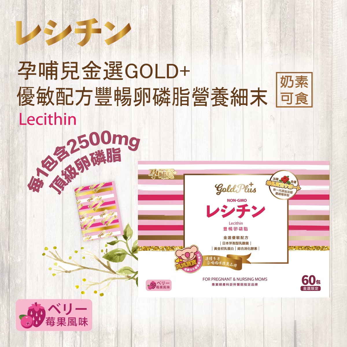 ★金選頂級系列全新升級添加法國蔓越莓,清新呵護!歐盟非基改卵磷脂來源、添加珍貴頂級金絲燕燕窩,每包高達2,500mg精純卵磷脂,金選配方3大頂規優敏配方:益生菌+黃金初乳+綜合酵素,莓果風味口感極佳,讓哺乳好順利!敏感體質卵磷脂推薦首選。✦孕哺兒卵磷脂不含EPA!孕哺媽咪可安心補充✦◆含磷脂質98%◆每包含精純卵磷脂2500毫克◆採用非基因改造卵磷脂◆成分最好吸收的劑型孕哺兒GOLD+優敏配方豐暢卵磷脂營養細末,全新升級添加法國蔓越莓,清新呵護!每包含2,500mg非基因改造頂級卵磷脂,精選珍貴金絲燕燕窩成分,升級添加珍貴日本芽孢型乳酸菌及頂級黃金初乳,幫助維持消化道機能,調整寶寶及媽咪敏感體質,淡淡莓果口味,美味好吸收,是孕哺期媽咪的最佳營養補充品。★孕哺兒金選 孕期金三寶特選黃金初乳、日本芽孢型乳酸菌、植物綜合消化酵素等,孕期金選優敏配方,給媽咪最頂級的營養補給。◆低溫低壓 頂級黃金初乳美國A級牧場頂規黃金初乳,採用16小時內精華初乳,低溫低壓製程,保留重要活性成分及營養素,孕哺媽咪體質好壯壯。◆日本芽孢型乳酸菌新一代多機能益生菌,具備多機能調整功效,維持消化道機能,幫助孕哺媽咪調整敏感體質,給寶貝優質成長環境。◆植物綜合消化酵素由天然植物萃取酵素來源,能幫助各式營養素分解吸收,媽媽營養吸收好,寶貝頭好壯壯。主要成分:非基因改造卵磷脂(97%高純度) 、葡萄糖、 玉米來源可溶性纖維、牛奶鈣、草莓果汁粉、半乳寡糖 、法國蔓越莓粉、香料、植物綜合消化酵素、芽孢型乳酸菌、維生素E 、日本燕窩抽出物(金絲燕燕窩) 、牛初乳蛋白、磷脂質絲胺酸PS 、銀耳多糖規格容量:劑型:細末。內容量:4gX60包入。食用建議:◆懷孕期:毎日1-4包。◆哺乳期:每日1-4包。◆6個月以上乳兒:每日1/2-1包。◆幼兒、兒童:每日1包。◆一般成人:每日1-2包。◆可直接分次口投,或加入飲品內混合後飲用,亦可調配入副食品內供寶寶食用。注意事項:◆本品含牛奶製品,不適合其過敏體質者食用。夏天平均溫度高,本產品天然純正,風味易隨季節變化略為改變,敬請放心食用。◆建議放置於陰涼乾燥處(或放置於冰箱內)妥善保存