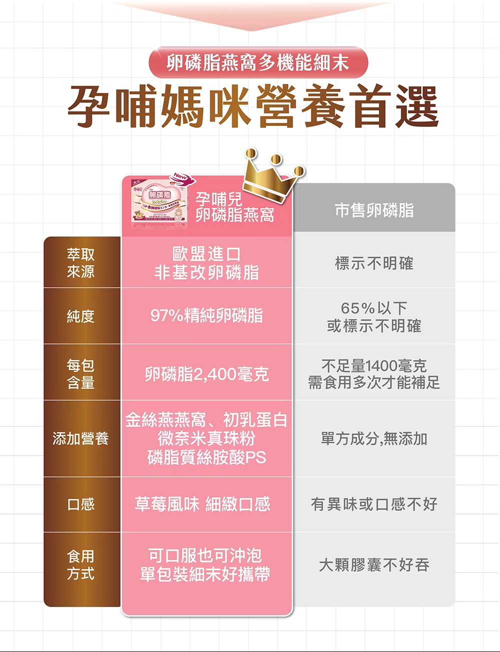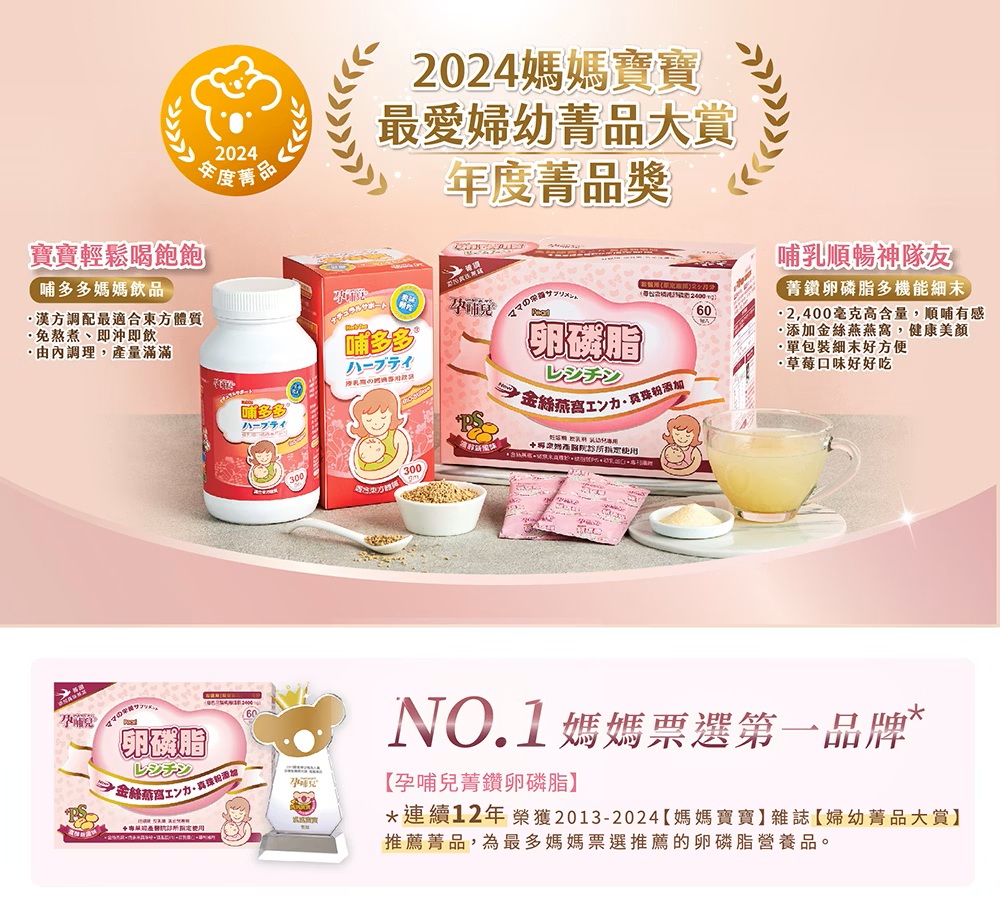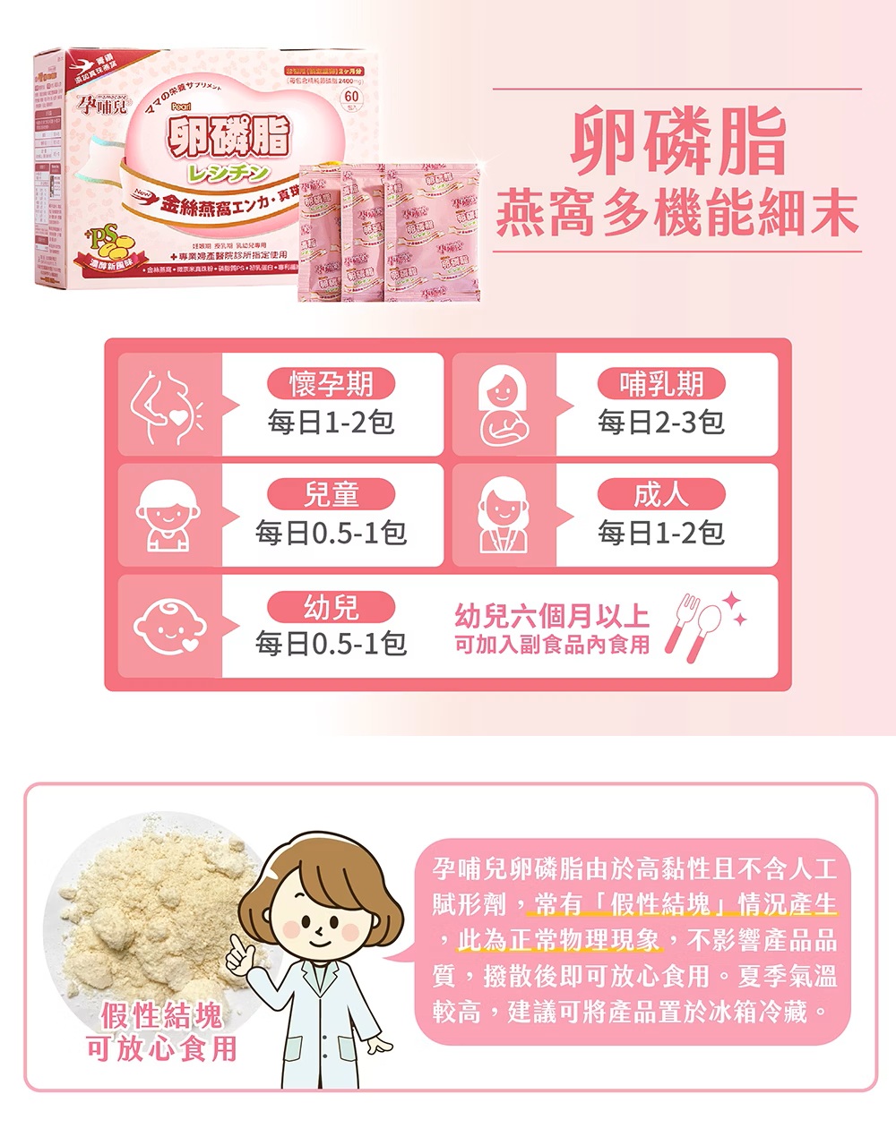 孕哺兒Ⓡ卵磷脂燕窩多機能細末✦蟬聯12年媽媽寶寶婦幼精品大賞,數萬名媽媽指定懷孕卵磷脂✦榮獲醫院婦產科、月子中心信賴選用的孕婦卵磷脂,順暢有感✦每包含2,400毫克精純卵磷脂,草莓風味口感極佳✦添加珍貴金絲燕燕窩,溫潤食補健康美麗更加分✦孕哺兒卵磷脂不含EPA!孕哺媽咪可安心補充主要成分:非基因改造卵磷脂(97%高純度;含豐富磷脂膽鹼)、玉米來源可溶性纖維、葡萄糖、牛奶鈣、果汁粉、香料、維生素E、金絲燕燕窩、微奈米真珠粉、初乳蛋白、磷脂質絲胺酸PS規格容量:劑型:細末。內容量:4gX60包入食用建議:◆懷孕期:毎日1-2包。◆哺乳期:每日1-2包。◆6個月以上乳兒:每日1/2-1包。◆幼兒、兒童:每日1包。◆一般成人:每日1-2包。◆可直接分次口投,或加入飲品內混合後飲用,亦可調配入副食品內供寶寶食用。注意事項:◆非素食。◆本品含大豆與牛奶製品,不適合其過敏體質者食用。◆為保產品品質,請收納放置於陰涼乾燥處,避免陽光直射,或放置於冰箱內,妥善保存,開封後請於6個月內食用完畢。◆夏天平均溫度高,本產品天然純正,風味易隨季節變化略為改變,敬請放心食用。★哺乳營養品必備首選-卵磷脂&哺多多「卵磷脂燕窩多機能細末」及「哺多多媽媽飲品」榮獲2024媽媽寶寶最愛菁品大賞「年度菁品獎」。◆卵磷脂燕窩多機能細末-哺乳順暢神隊友.2400毫克高含量孕婦卵磷脂,順哺有感.添加金絲燕燕窩,健康美顏.單包裝細末好方便.草莓口味好好吃◆哺多多媽媽飲品-寶寶輕鬆喝飽飽.漢方調配最適合東方體質.免熬煮、即沖即飲.由內調理,產量滿滿