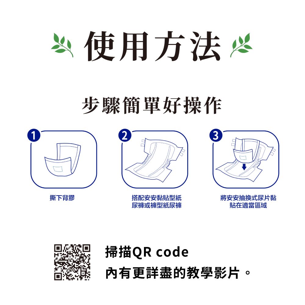 (注意事項)※至少每三小時更換一次,以避免因太潮濕而引發其他不適。※使用後請將尿片上的排泄物,倒入馬桶清理後,將尿片由外側向內側捲起後,再行丟棄。※請勿將紙尿片丟入馬桶內。