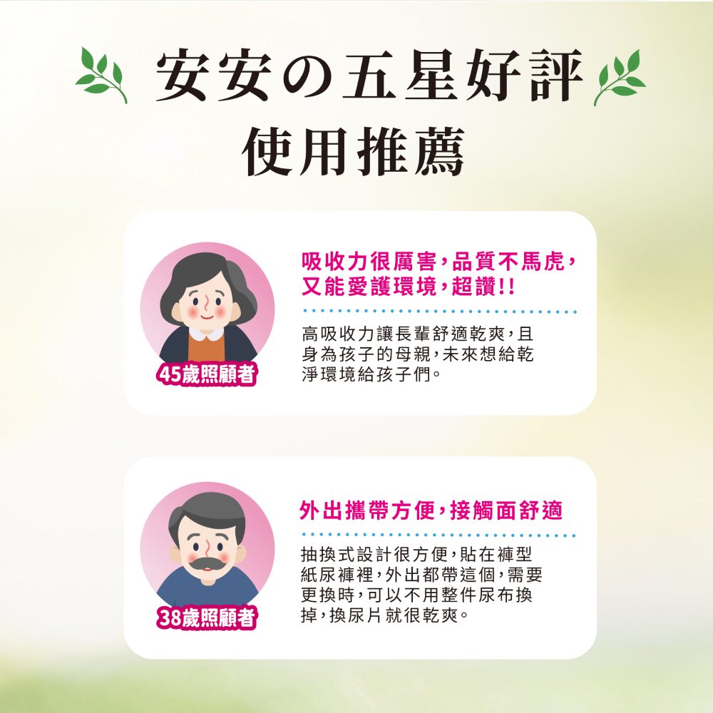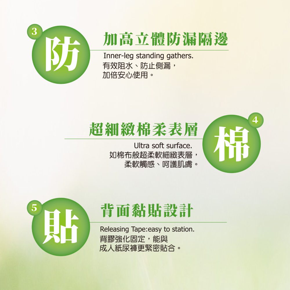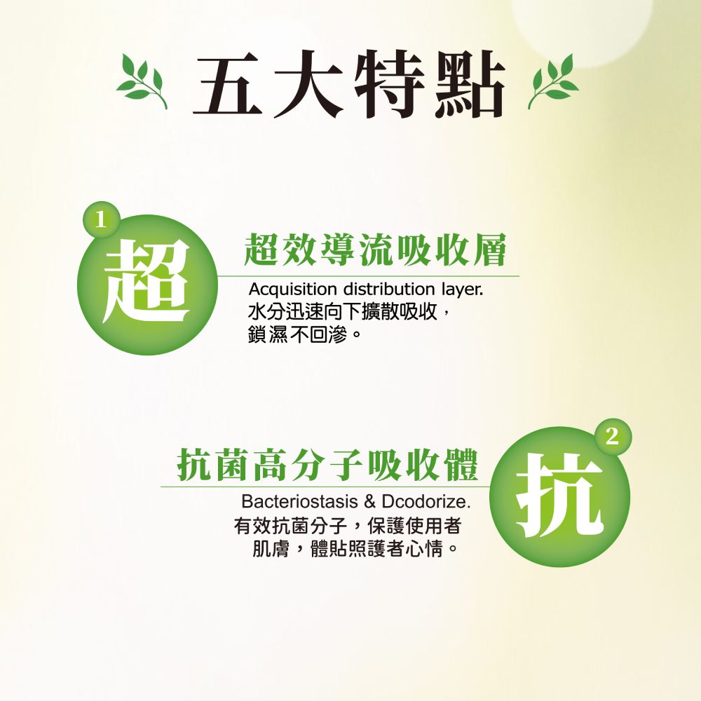 •超效導流吸收層,水份迅速向下擴散吸收,有效鎖水不回滲•強化背膠固定設計,防止滑動•加高立體防漏隔邊,安心不側漏•超細緻棉柔表層,柔軟觸感、呵護肌膚