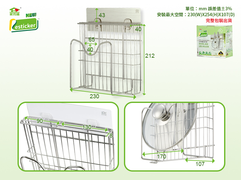 品名:家而適料理刀砧板鍋蓋壁掛架尺寸:請看上方商品縮圖之一材質:鍍鉻鋼線、強黏無痕膠、PP、PC塑膠產地:台灣一入裝含:置物架X1、標準雙勾強力貼膠片X1、無痕輔助膠片X1、承重保固卡X1膠片設計承重:SGS檢驗15KG 鑑驗編號:M423756安全承重:6KG以下