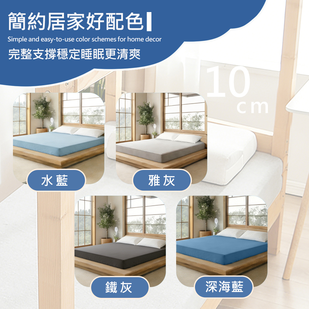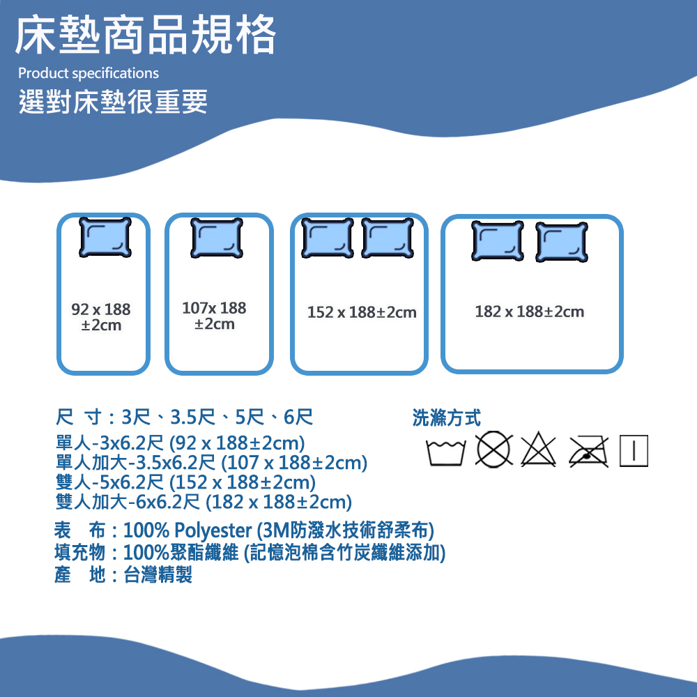 內容/規格:10CM雙人-5x6.2尺(150x188±2cm)表布:100% Polyester (3M防潑水技術舒柔布)填充物:100%聚酯纖維 (高密度記憶泡棉)(含竹碳纖維)床墊套洗滌方式:可水洗/不可烘乾/不可漂白/懸掛晾乾/不可熨燙原產地:台灣精製