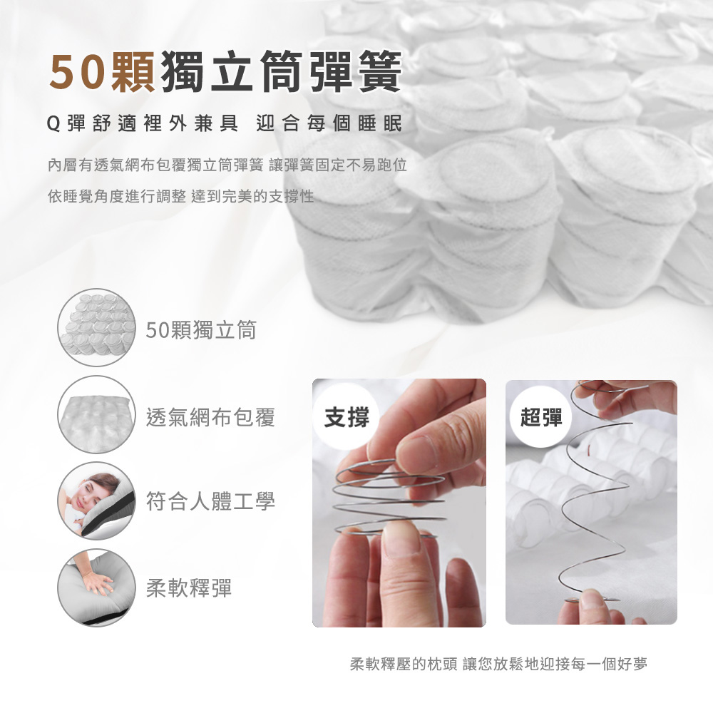 【細緻極佳觸感,讓您一夜好眠】● 柔和軟綿,天然親膚● 加強循環助好入眠● 50顆獨立筒,快速回彈,完美支撐【商品規格】表布:石墨烯纖維+聚酯纖維(polyester)