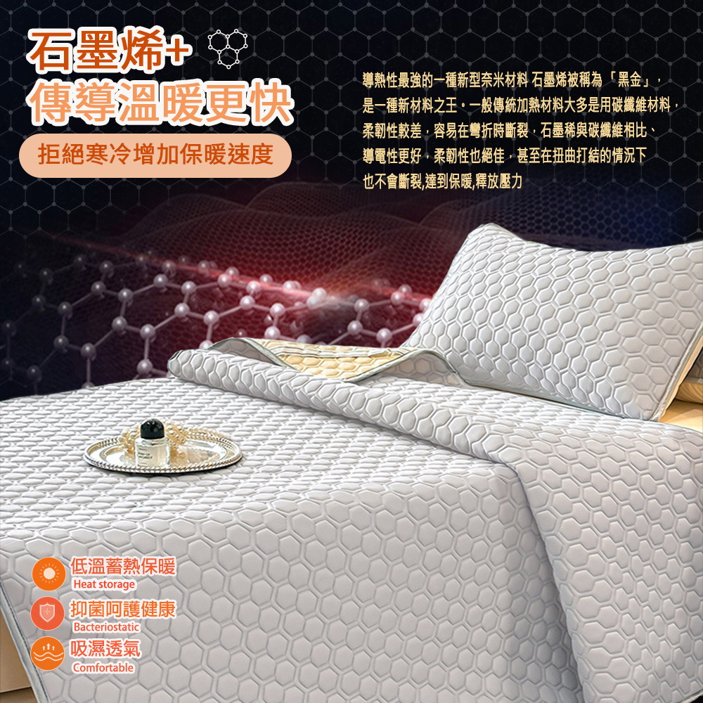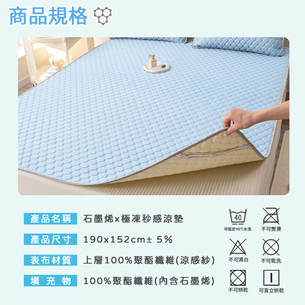 尺寸:152*190cm±5% 表布:100%聚酯纖維(涼感紗) 內容物:100%聚酯纖維(內含石墨烯)產地:韓國