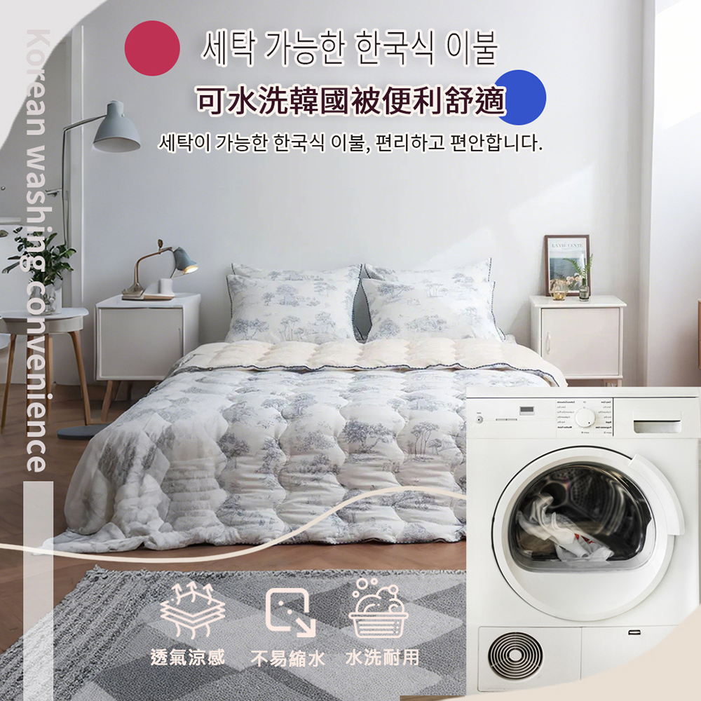 表布材質:(圖案面)聚酯纖維100%裡布材質:(素色毛絨面)5mm毛絨超細纖維100%填充物:聚酯纖纖維100%(玉米鬚纖維)尺寸/重量:150X205CM (±5cm)/ 2KG產地:韓國洗滌處理方式·水溫不可超過30*C/不可漂白/不可乾洗/不可烘乾/不可燙熨上述尺寸重量為人工測量±5%誤差值為正常範圍