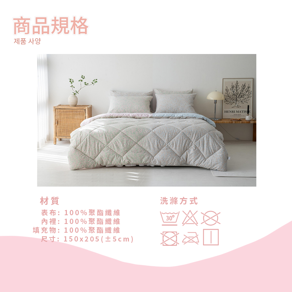 表布材質:聚酯纖維 (超細纖維100%)裡布材質:聚酯纖維 (超細纖維100%)填充物:聚酯纖纖維100%(玉米鬚纖維)尺寸/重量:150X205CM (±5cm)/1.7KG產地:韓國洗滌處理方式·水溫不可超過30*C/不可漂白/不可乾洗/不可烘乾/不可燙熨上述尺寸重量為人工測量±5%誤差值為正常範圍