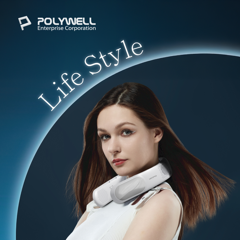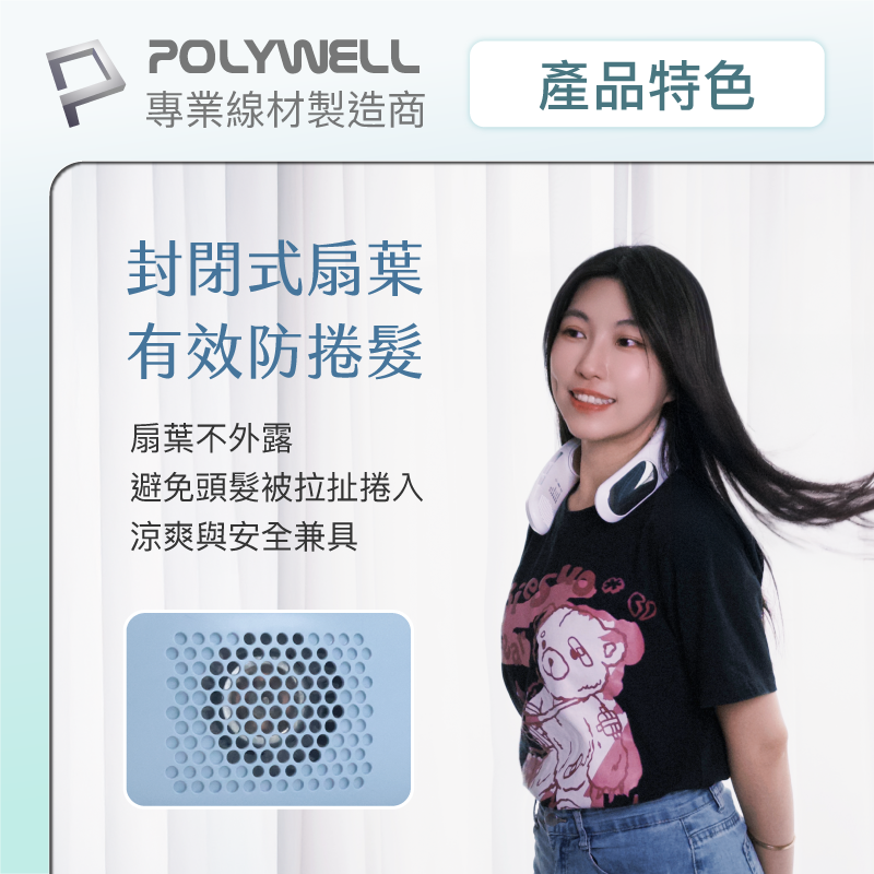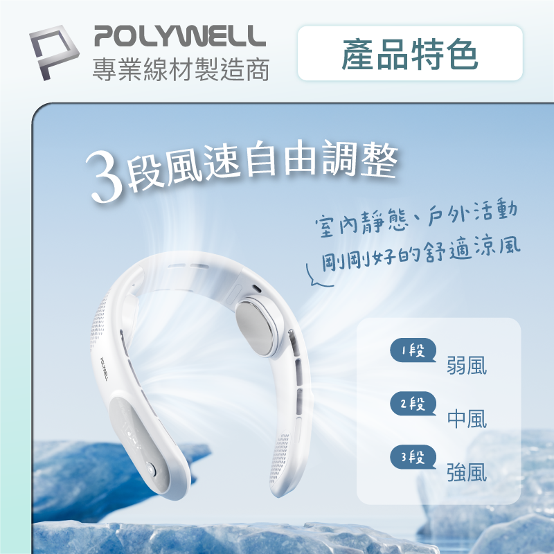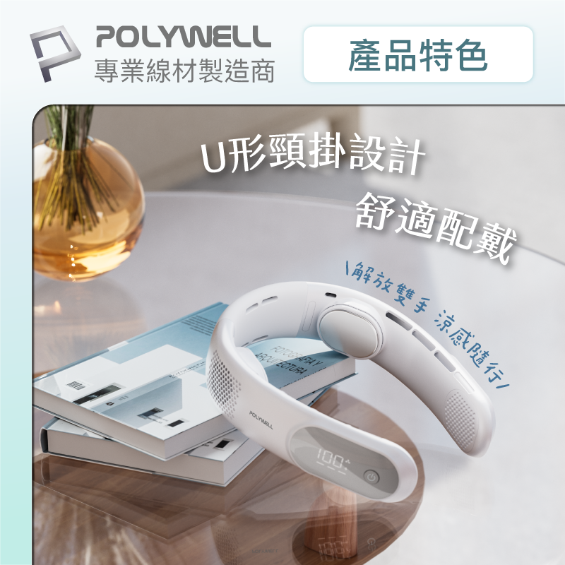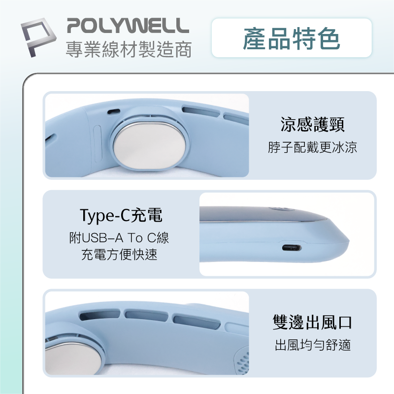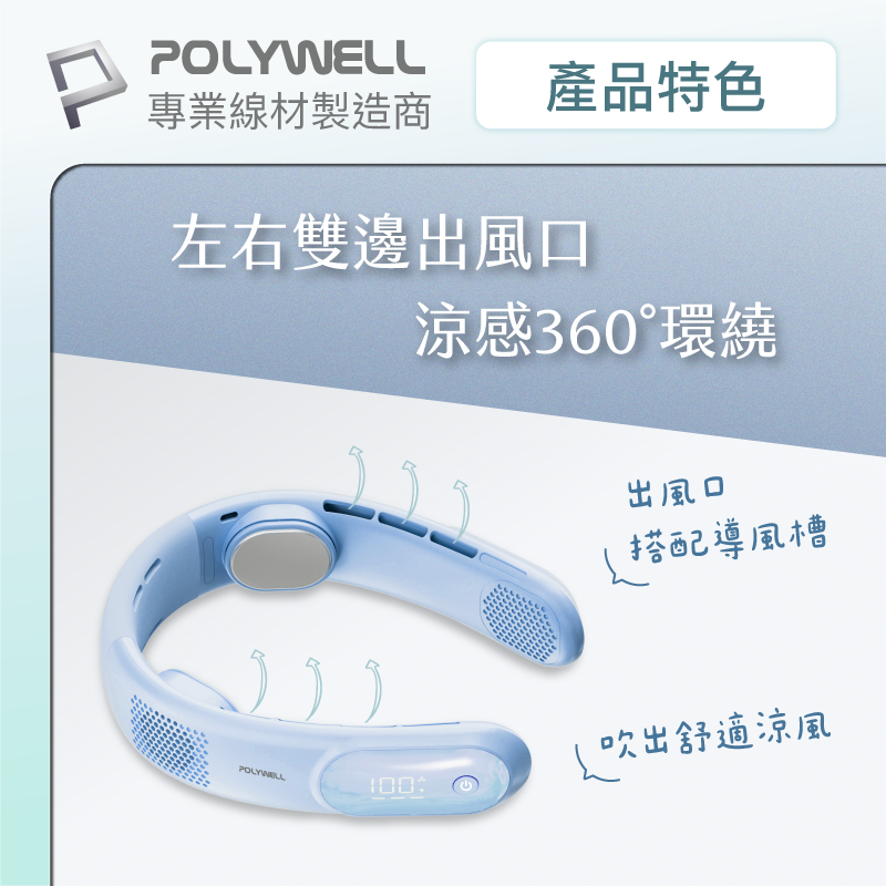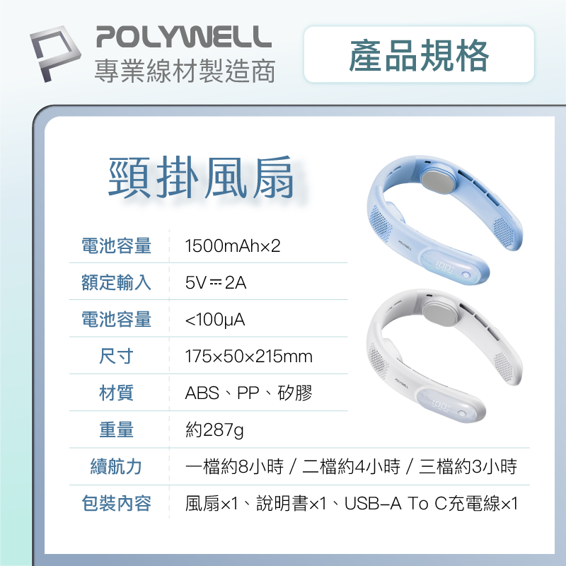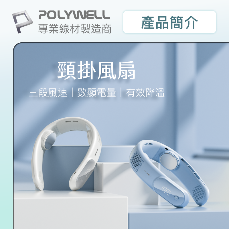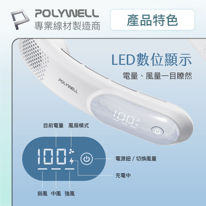 【POLYWELL】掛脖散熱風扇 頸掛涼感電扇 LED數顯電量 Type-C充電 防捲髮 輕量風扇/白色/淺藍色