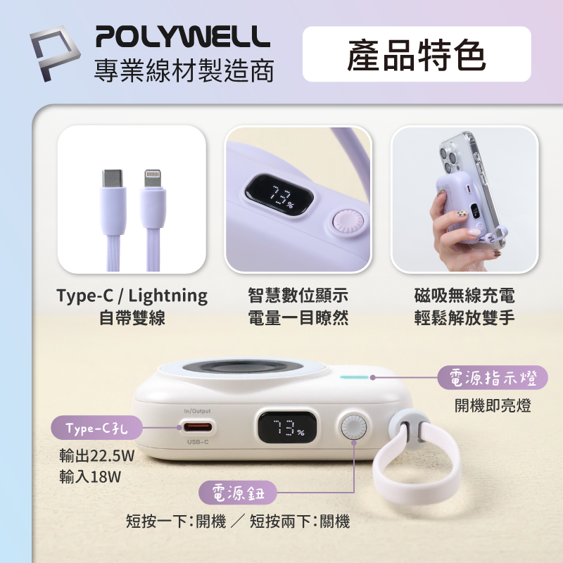 【Type-C雙向快充】支援Type-C 18W輸入快速回充; 22.5W輸出為手機快充