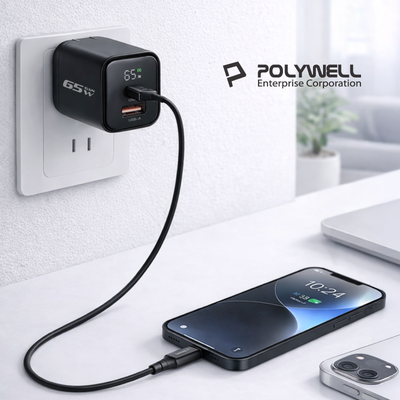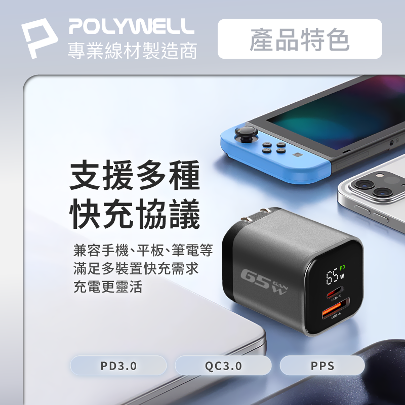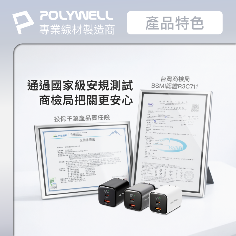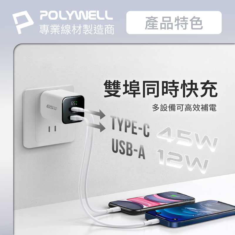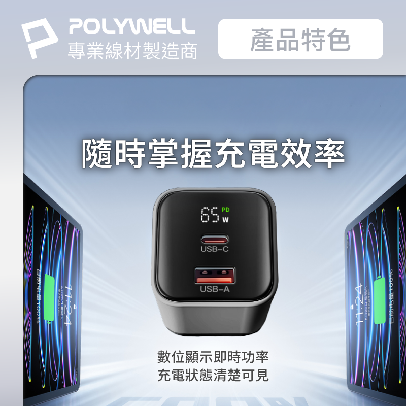 ◎ 產品:POLYWELL 65W數顯雙孔PD快充頭
