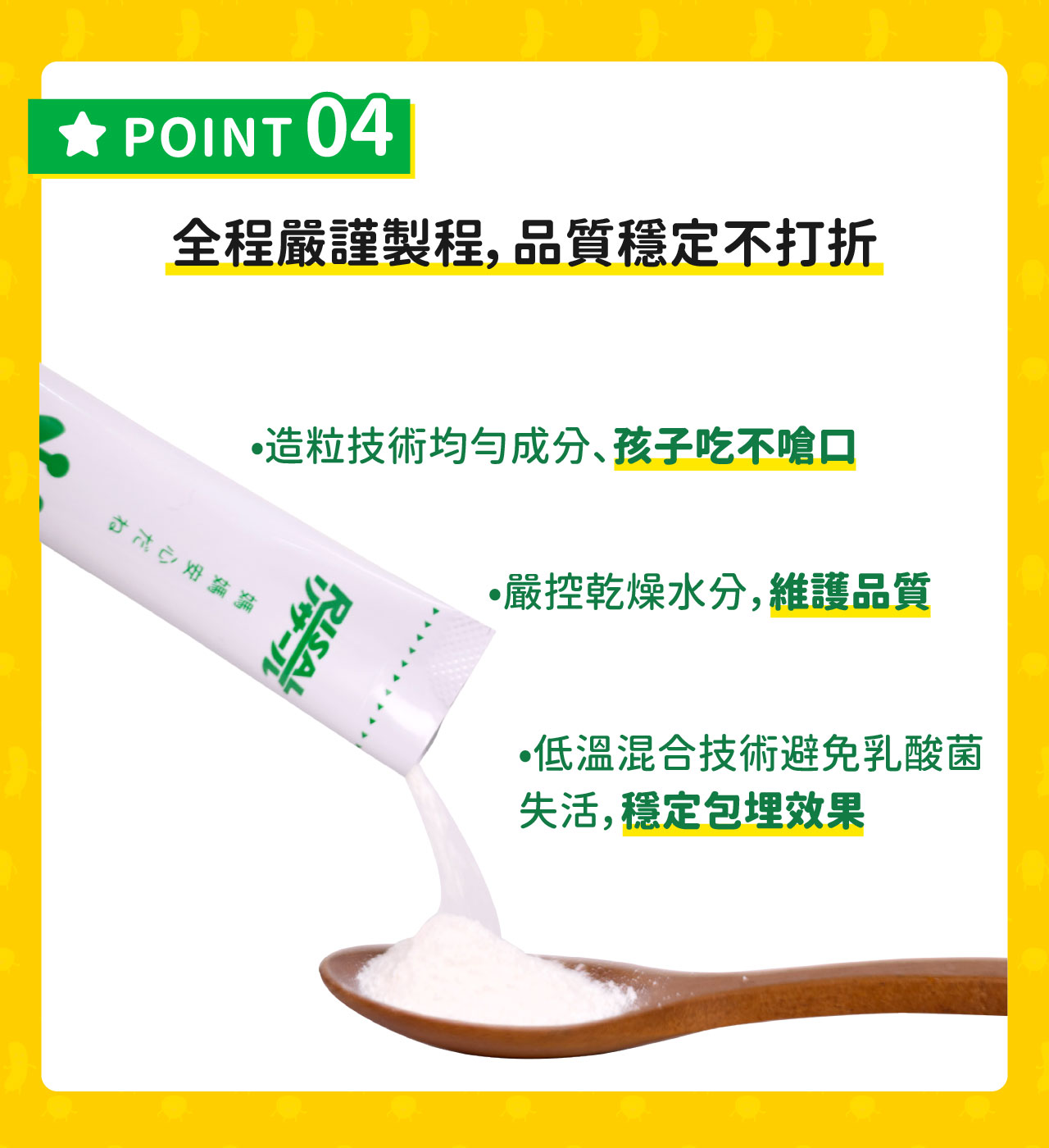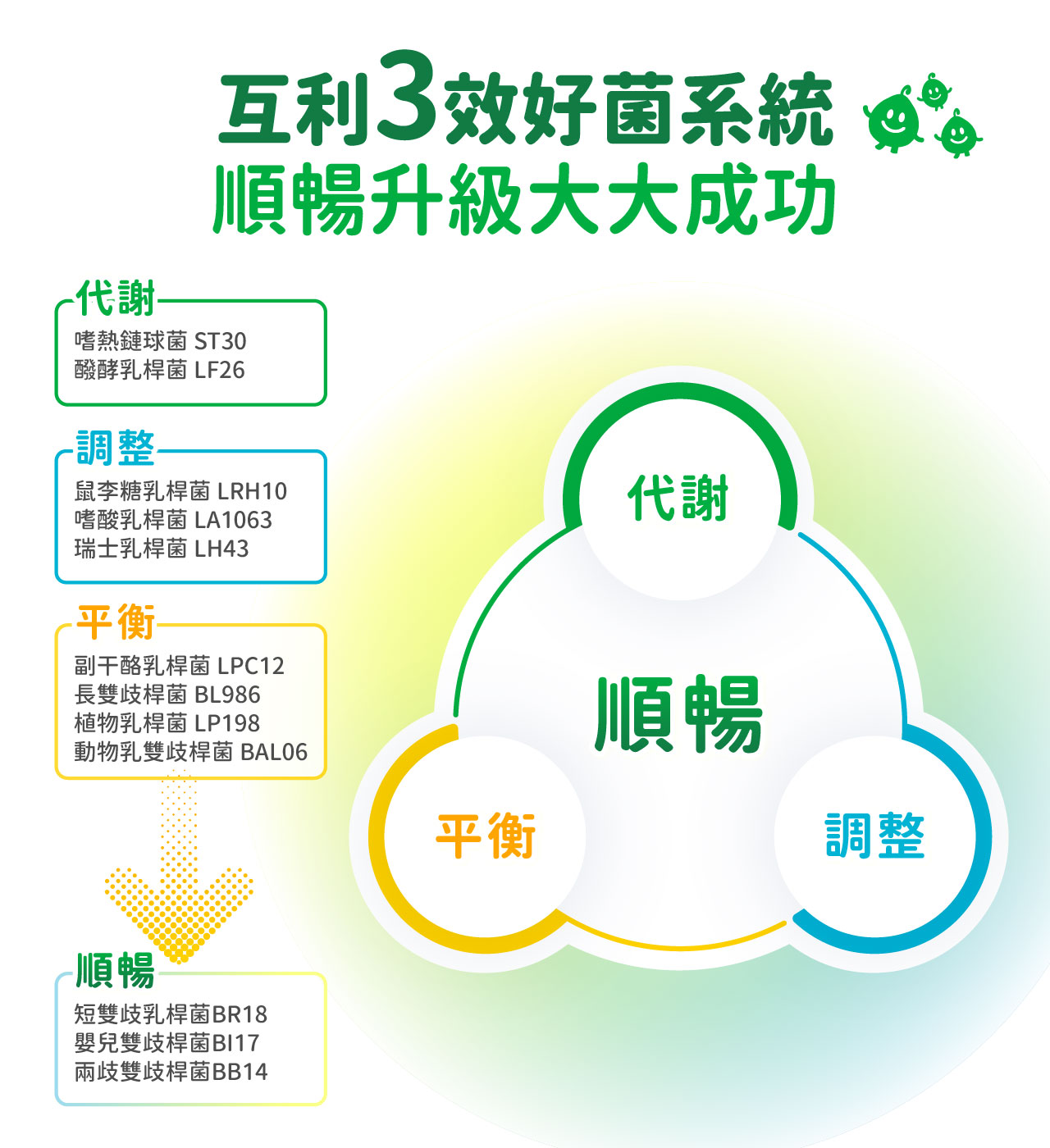 全成分:果寡醣粉(非基改玉米澱粉、果寡醣)、海藻糖、微結晶狀 α- 纖維素、乳酸菌( 植物乳桿菌 (Lactobacillus plantarum LP198) 、 動物(乳)雙歧桿菌 (Bifidobacterium animalis subsp. lactis BAL06)、 醱酵乳 桿菌 (Lactobacillus fermentum LF26) 、鼠李糖乳桿菌 (Lactobacillus rhamnosus LRH10) 、 副干酪乳桿菌 (Lactobacillus paracasei LPC12) 、 嬰兒雙歧桿菌 Bifidobacterium longum subsp. Infantis BI17) 、 長雙歧 桿菌 Bifidobacterium longum BL986) 、 短雙歧乳桿菌 Bifidobacterium breve BR18) 、 嗜酸乳桿菌 (Lactobacillus acidophilus LA1063 、 兩歧雙歧桿菌 Bifidobacterium bifidum BB14) 、 嗜熱鏈球菌 (Streptococcus thermophilus ST30) 、瑞士乳桿菌 (Lactobacillus helveticus LH43)、 香料、 檸檬酸 。