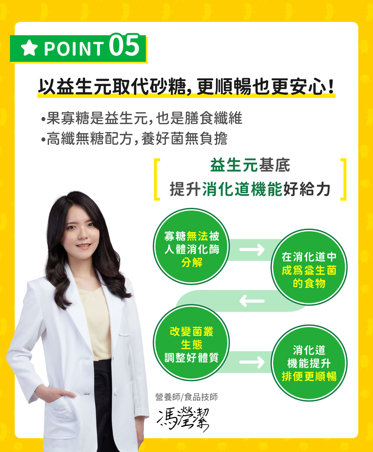 ●添加12種菌株益菌配方,多元完整的益生菌,改變消化道菌叢,幫助排便順暢。●以益生元為基底的無砂糖高纖配方,維持消化道機能,減少精製糖添加,少負擔、多健康。●選用專利包埋技術菌種配方(專利號:M603759),通過胃酸膽鹼試驗,幫助益菌安全抵達腸道,維持消化道健康。●使用獨特乳酸菌共生發酵技術,保留豐富的發酵微量產物,補充微量營養素。○無砂糖 ○無色素 ○無防腐劑 ○高纖