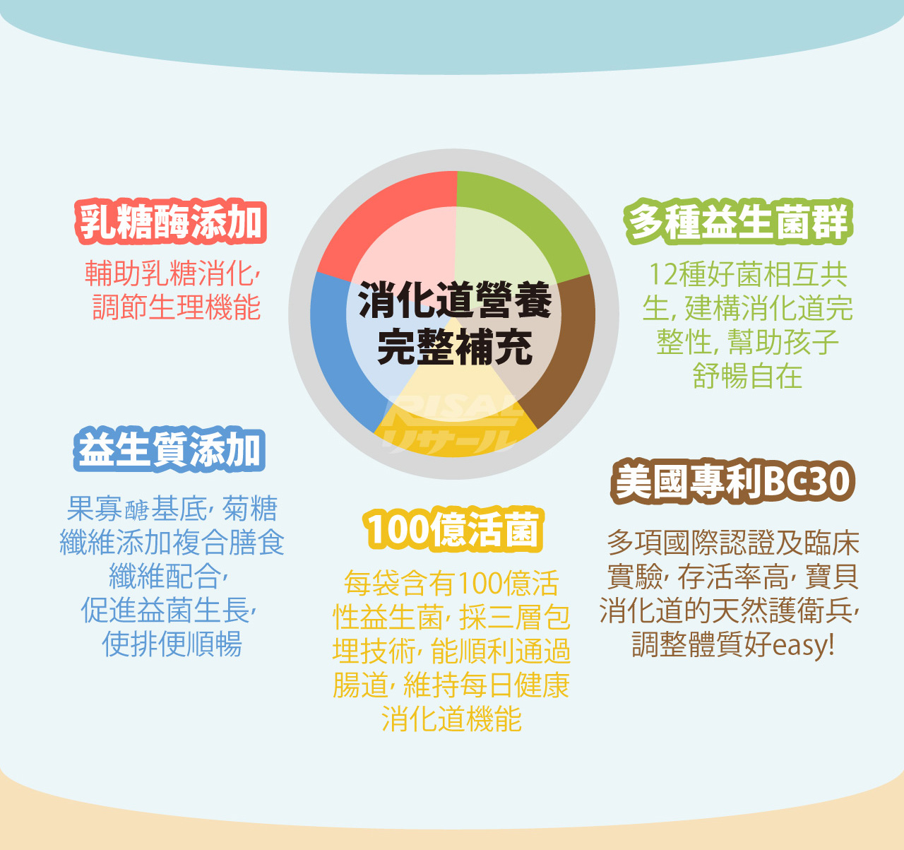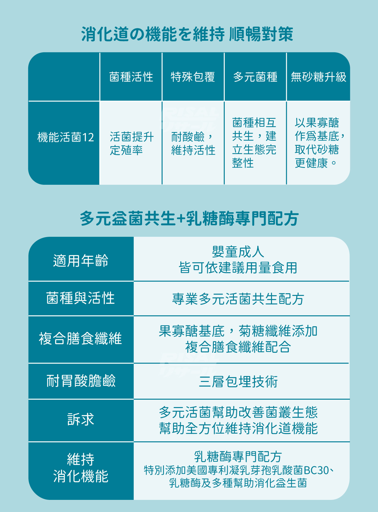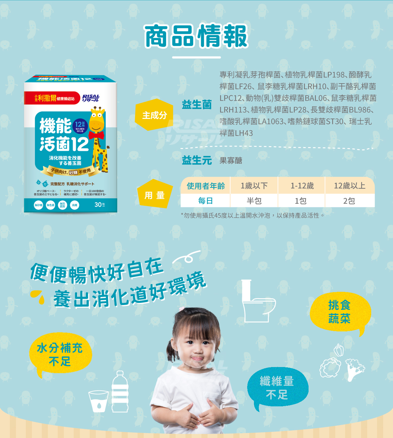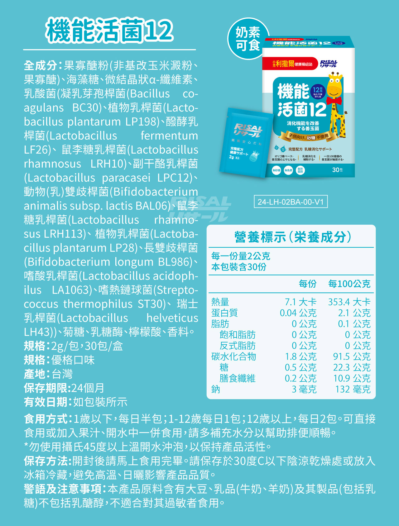 全成分:果寡醣粉(非基改玉米澱粉、果寡醣)、海藻糖、微結晶狀α-纖維素、乳酸菌(凝乳芽孢桿菌(Bacillus coagulans BC30)、植物乳桿菌(Lactobacillus plantarum LP198)、醱酵乳桿菌(Lactobacillus fermentum LF26)、 鼠李糖乳桿菌(Lactobacillus rhamnosus LRH10)、副干酪乳桿菌(Lactobacillus paracasei LPC12)、 動物(乳)雙歧桿菌(Bifidobacterium animalis subsp. lactis BAL06)、鼠李糖乳桿菌(Lactobacillus rhamnosus LRH113)、 植物乳桿菌(Lactobacillus plantarum LP28)、長雙歧桿菌(Bifidobacterium longum BL986)、 嗜酸乳桿菌(Lactobacillus acidophilus LA1063)、嗜熱鏈球菌(Streptococcus thermophilus ST30)、 瑞士乳桿菌(Lactobacillus helveticus LH43))、菊糖、乳糖酶、檸檬酸、香料。
