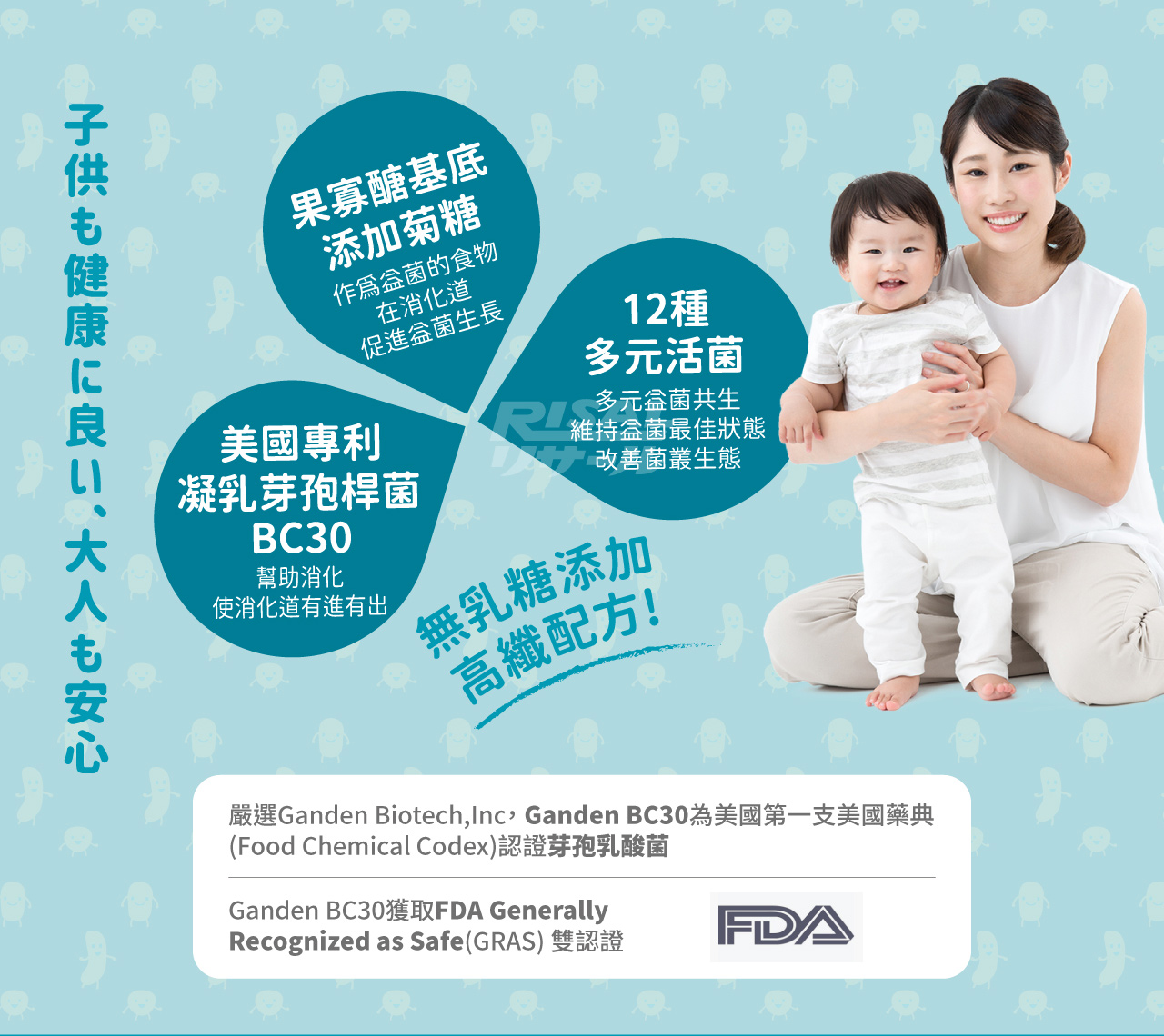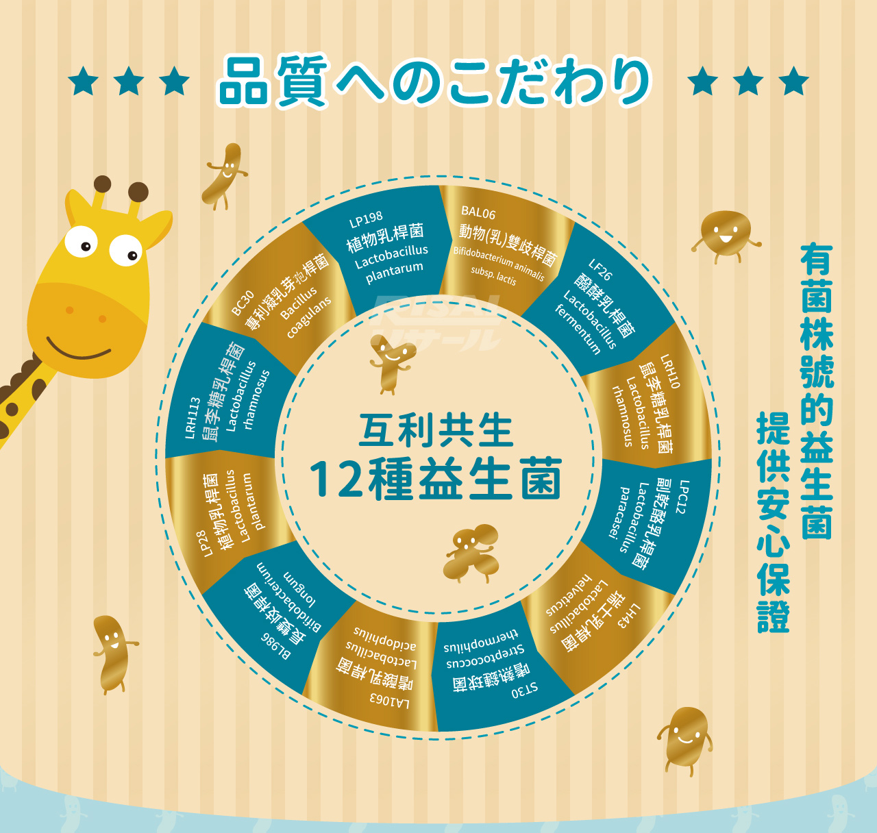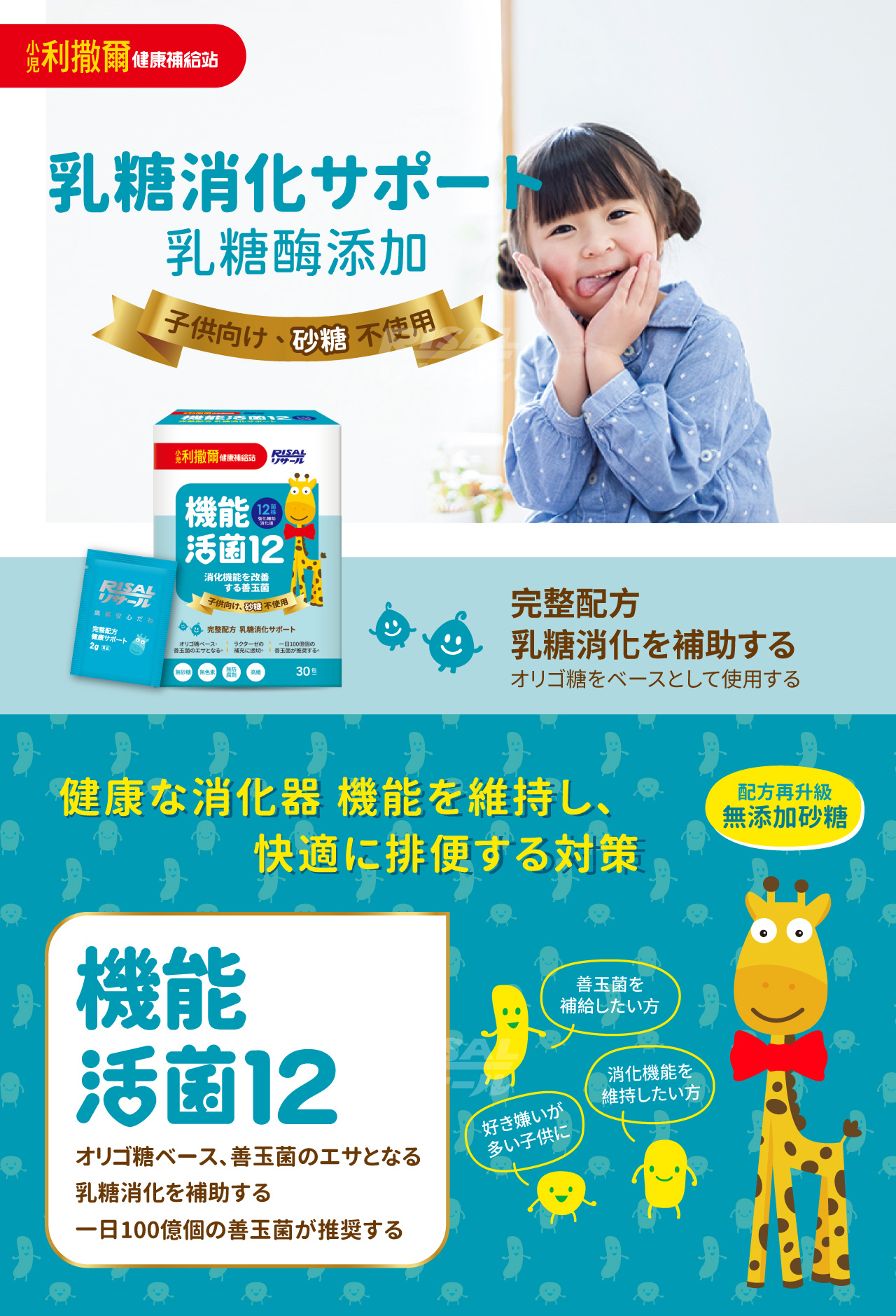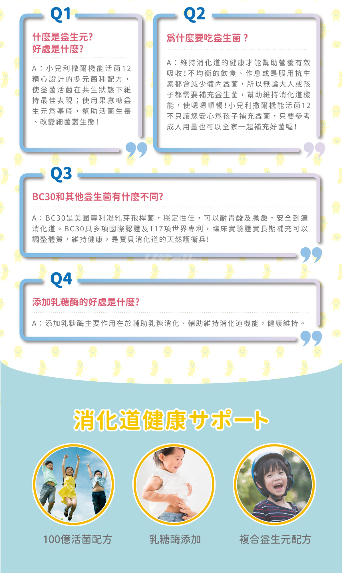 全成分:果寡醣粉(非基改玉米澱粉、果寡醣)、海藻糖、微結晶狀α-纖維素、乳酸菌(凝乳芽孢桿菌(Bacillus coagulans BC30)、植物乳桿菌(Lactobacillus plantarum LP198)、醱酵乳桿菌(Lactobacillus fermentum LF26)、 鼠李糖乳桿菌(Lactobacillus rhamnosus LRH10)、副干酪乳桿菌(Lactobacillus paracasei LPC12)、 動物(乳)雙歧桿菌(Bifidobacterium animalis subsp. lactis BAL06)、鼠李糖乳桿菌(Lactobacillus rhamnosus LRH113)、 植物乳桿菌(Lactobacillus plantarum LP28)、長雙歧桿菌(Bifidobacterium longum BL986)、 嗜酸乳桿菌(Lactobacillus acidophilus LA1063)、嗜熱鏈球菌(Streptococcus thermophilus ST30)、 瑞士乳桿菌(Lactobacillus helveticus LH43))、菊糖、乳糖酶、檸檬酸、香料。