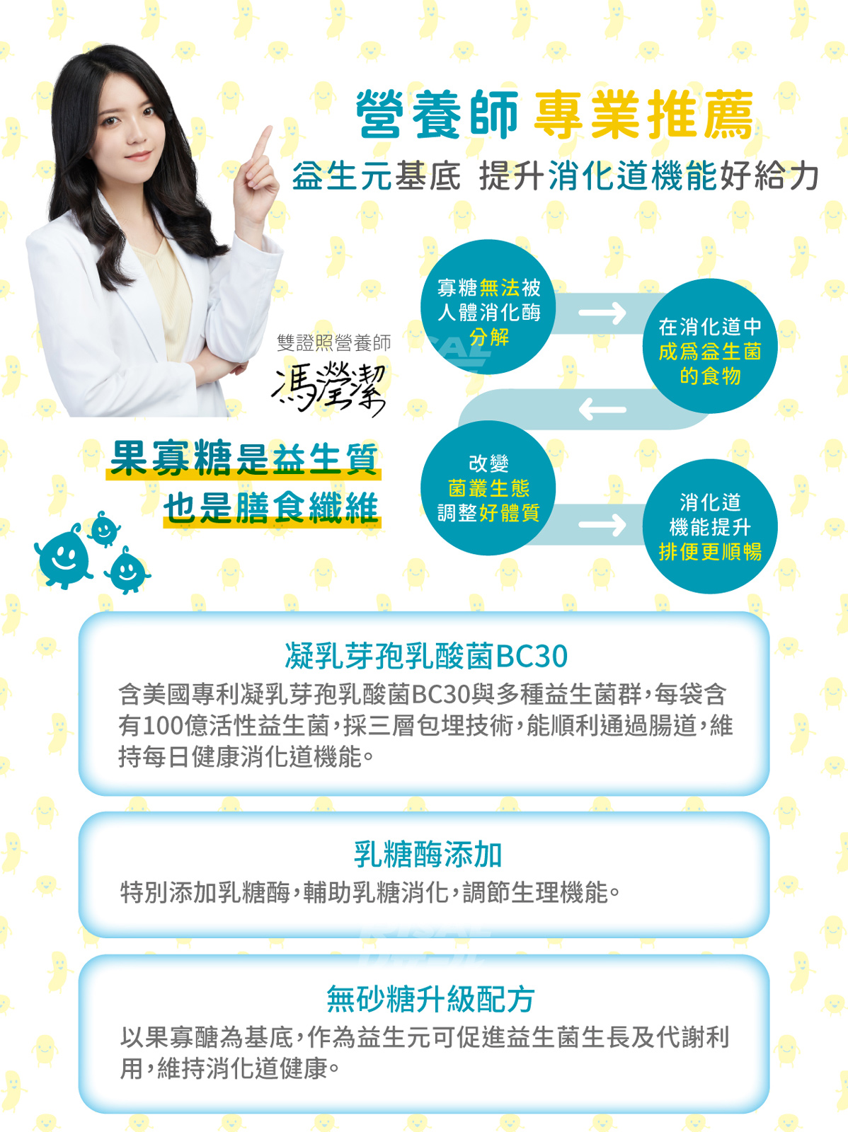 ● 含美國專利凝乳芽孢乳酸菌BC30等12種多元完整益生菌,改變消化道菌叢,幫助排便順暢。●以益生元為基底的無砂糖配方,維持消化道機能,減少精製糖添加,甜度低、減少負擔。●選用專利包埋技術菌種配方(專利號:M603759),通過胃酸膽鹼試驗,幫助益菌安全抵達腸道,維持消化道健康。● 乳糖酶添加配方,幫助消化、維持生理機能。○無砂糖、無色素、無防腐劑、高纖。