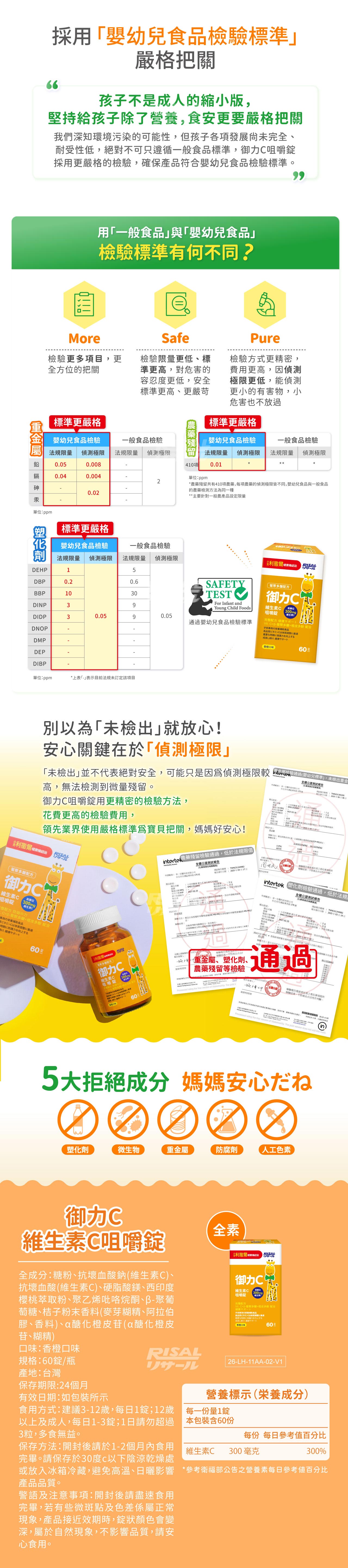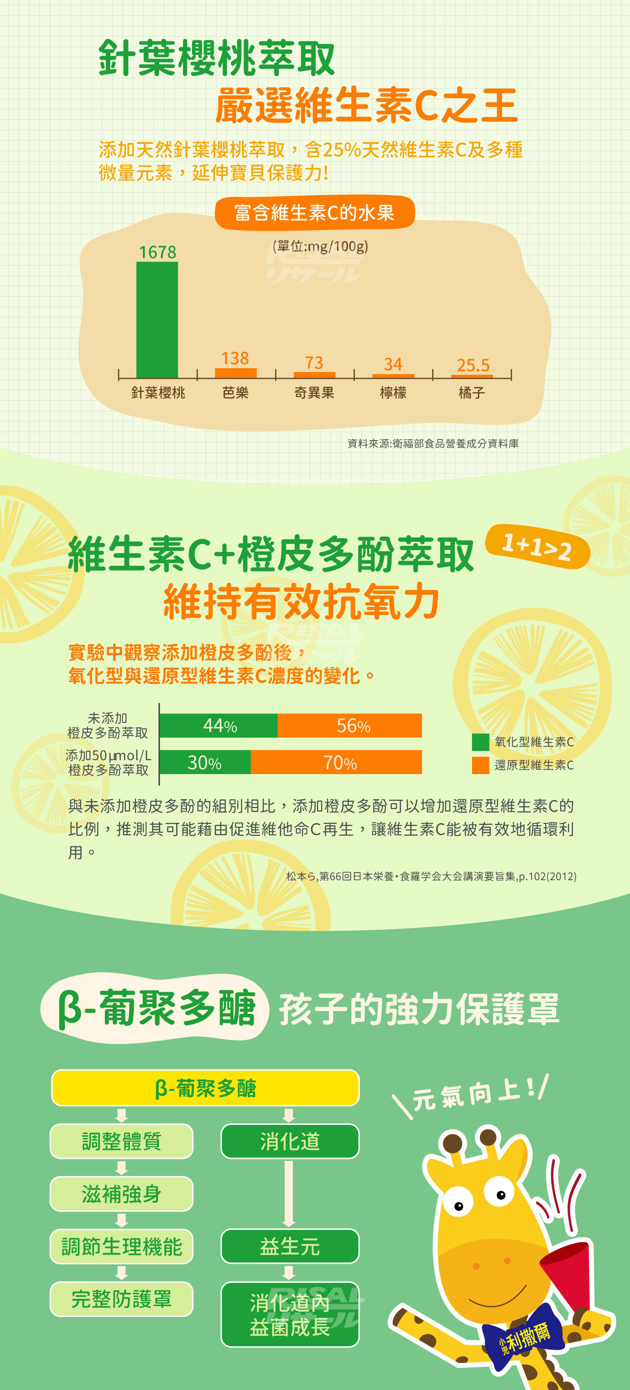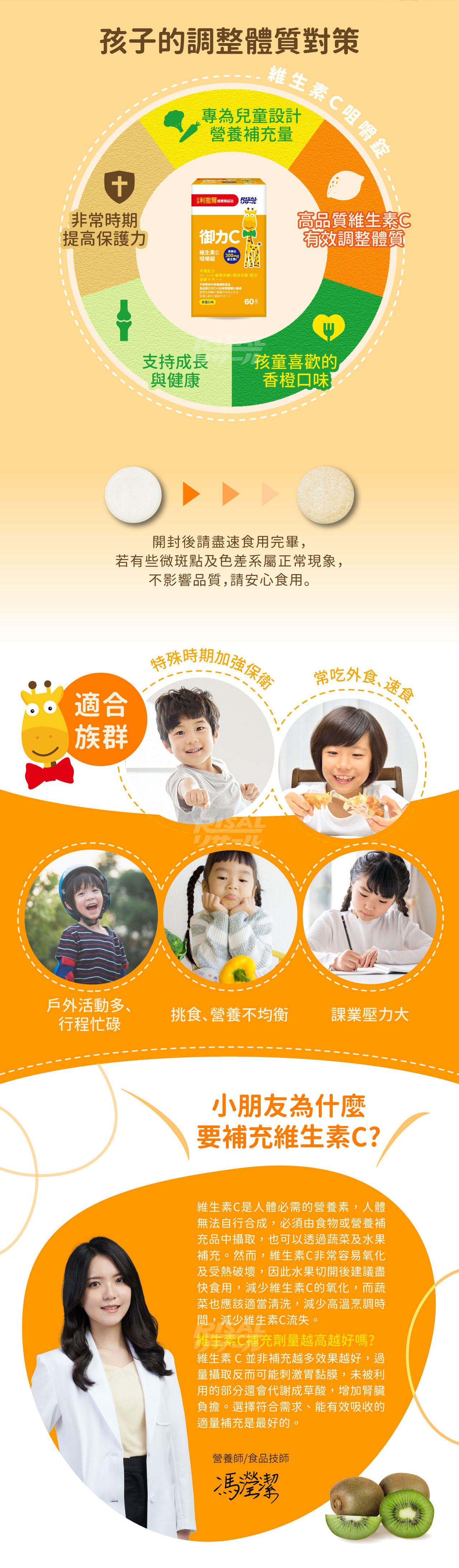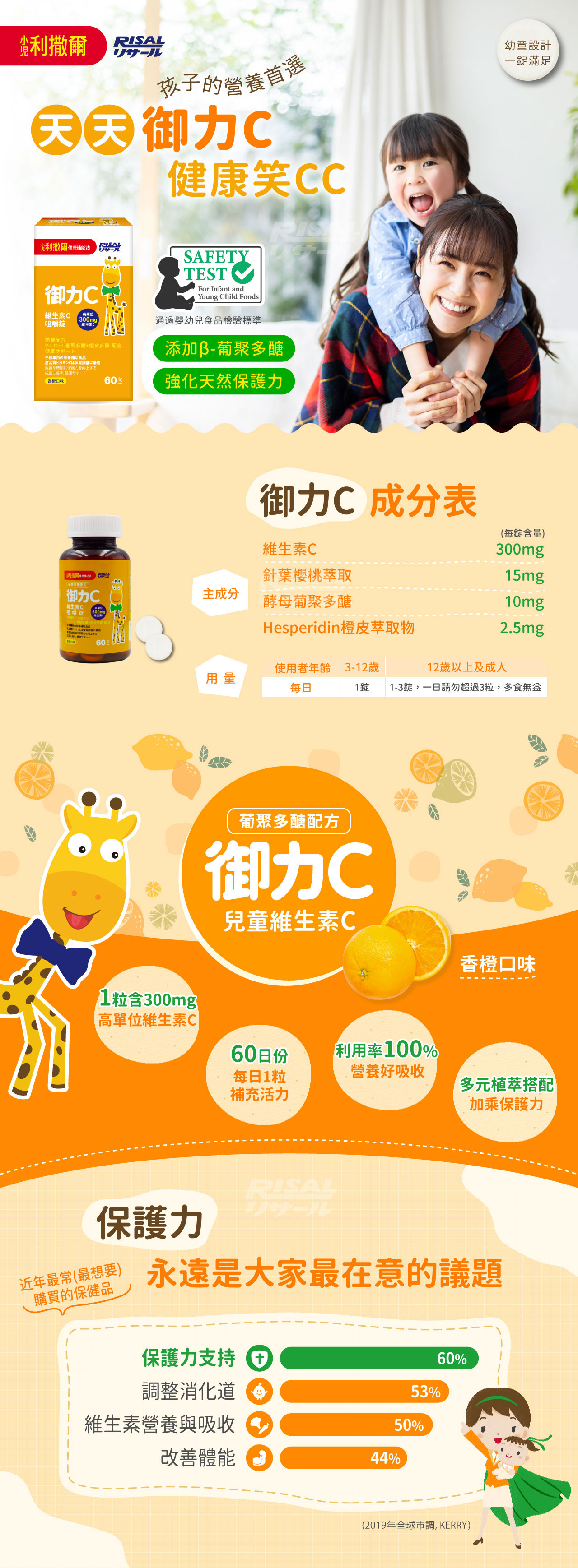完整配方 健康サポート˙高單位維生素C'、兒童設計300mg維生素C,具抗氧化作用,維持每日健康活力˙橙皮多酚萃取,天然柑橘萃取,保持維生素C利用率,促進循環代謝力˙酵母葡聚多醣,高活性β1,3/1,6-葡聚多醣,特殊活化萃取技術,提供天然保護力˙添加針葉櫻桃萃取,珍貴櫻桃植萃精華,含豐富衛生素C與天然營養,延續保護力˙香橙果汁粉調味,不添加防腐劑、色素及蔗糖素