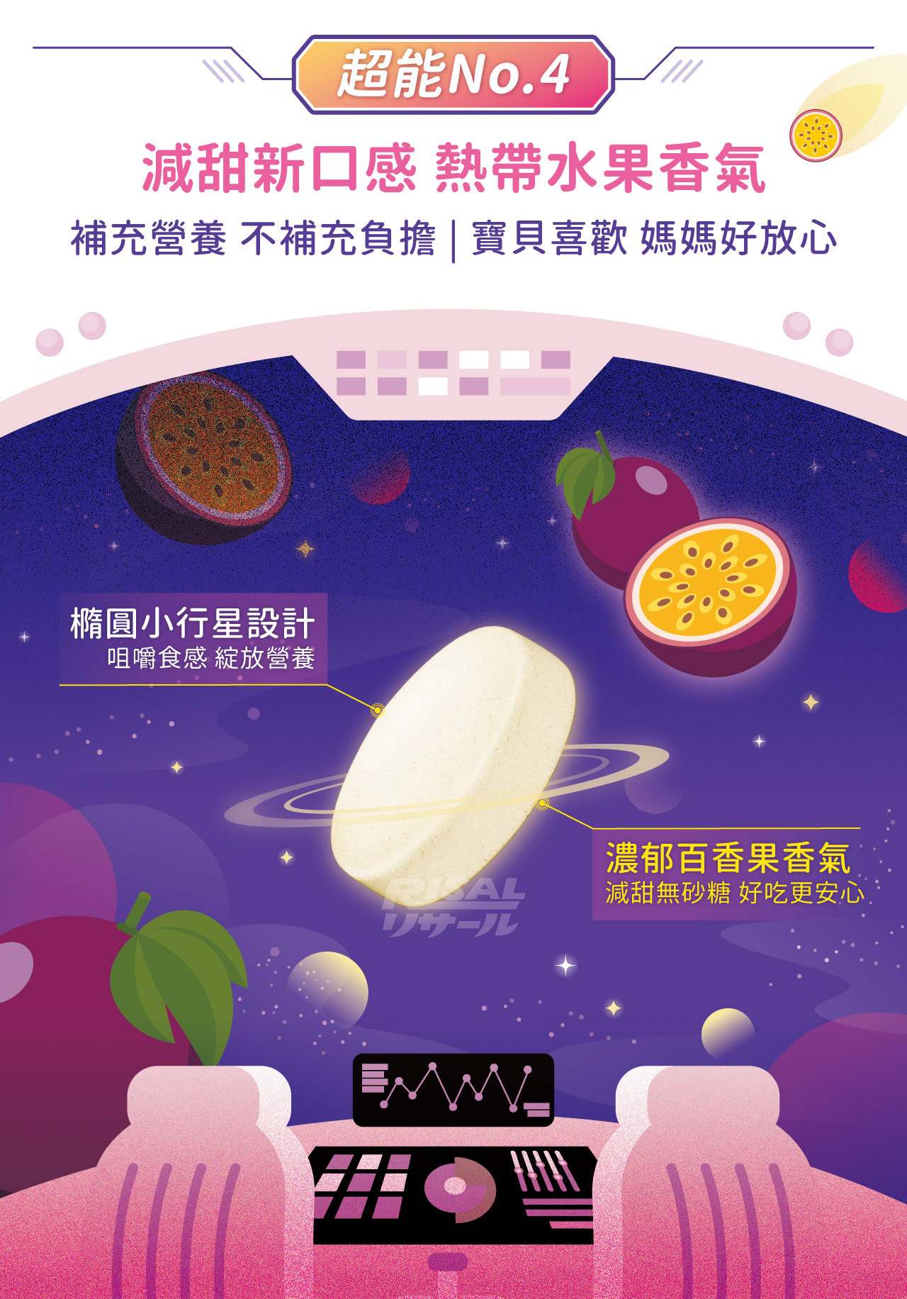 蔗糖、牛奶鈣、抗壞血酸(維生素C)、百香果香料【乳糖、二氧化矽、香料、丙二醇、維生素C(抗氧化劑)】、檸檬酸、維生素E 50%【乙酸dl-α-生育醇酯(維生素E)、乾燥葡萄糖漿、辛烯基丁二酸鈉澱粉、二氧化矽】、硬脂酸鎂、菸鹼醯胺、硫酸鋅、檸檬酸鐵、維生素A棕櫚酸酯粉【辛烯基丁二酸鈉澱粉、麥芽糊精、維生素A棕櫚酸酯油、糖、乙酸dl-α-生育醇酯(維生素E) (抗氧化劑)、二丁基羥基甲苯(抗氧化劑)】、二氧化矽、本多酸鈣、維生素D3【辛烯基丁二酸鈉澱粉、蔗糖、維生素C(抗氧化劑)、中鏈三酸甘油酯、二氧化矽、維生素E(抗氧化劑)、維生素D3】、維生素B12 0.1%(麥芽糊精、檸檬酸鈉、檸檬酸、維生素B12)、接骨木莓萃取物(麥芽糊精、接骨木莓萃取物)、鹽酸吡哆辛(維生素B6)、硝酸硫胺明(維生素B1)、核黃素(維生素B2)、香料粉【麥芽糊精、阿拉伯膠、香料、L-抗壞血酸(維生素C)(抗氧化劑)】、維生素K1(阿拉伯膠、維生素K1、蔗糖)、葉酸、生物素