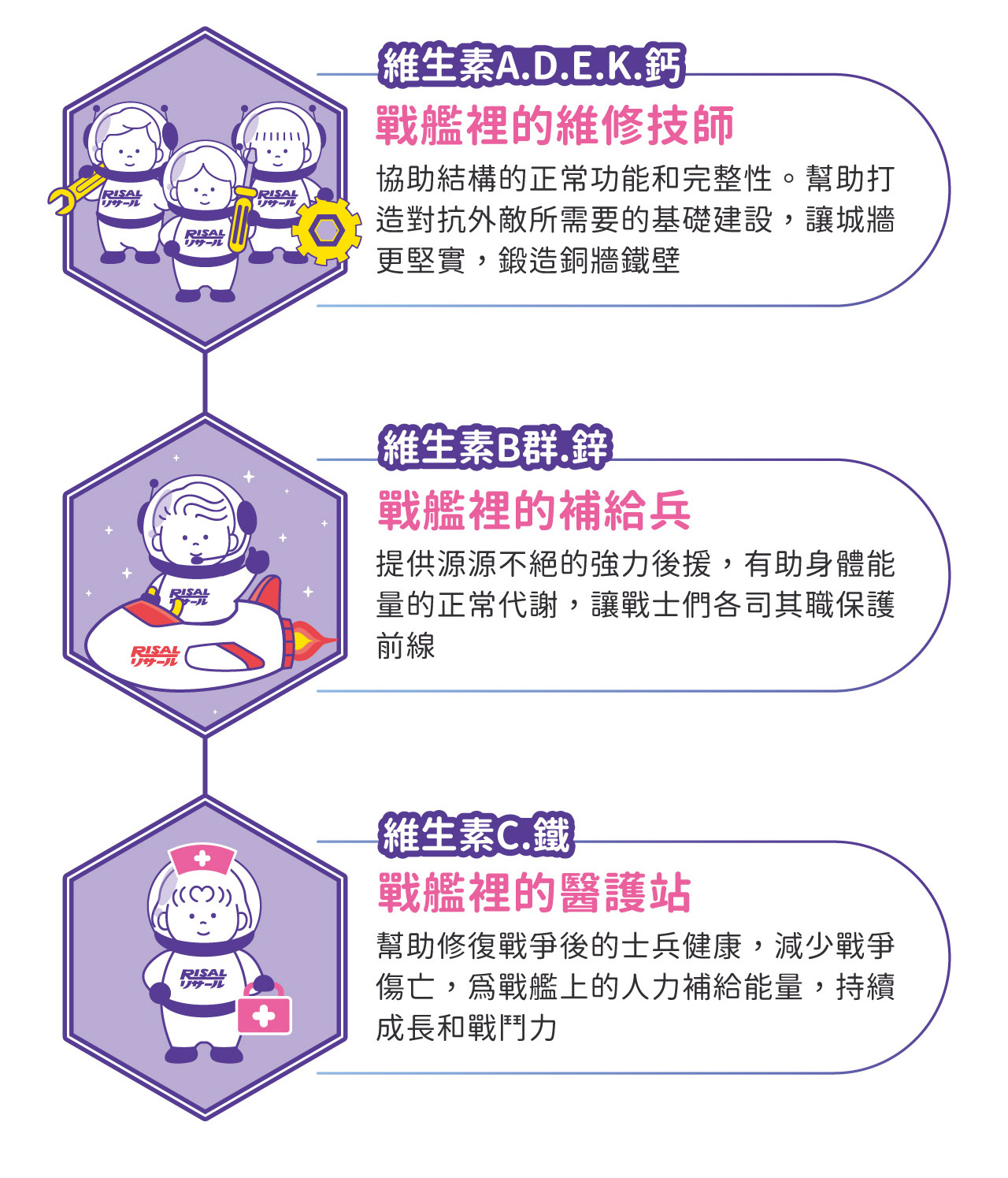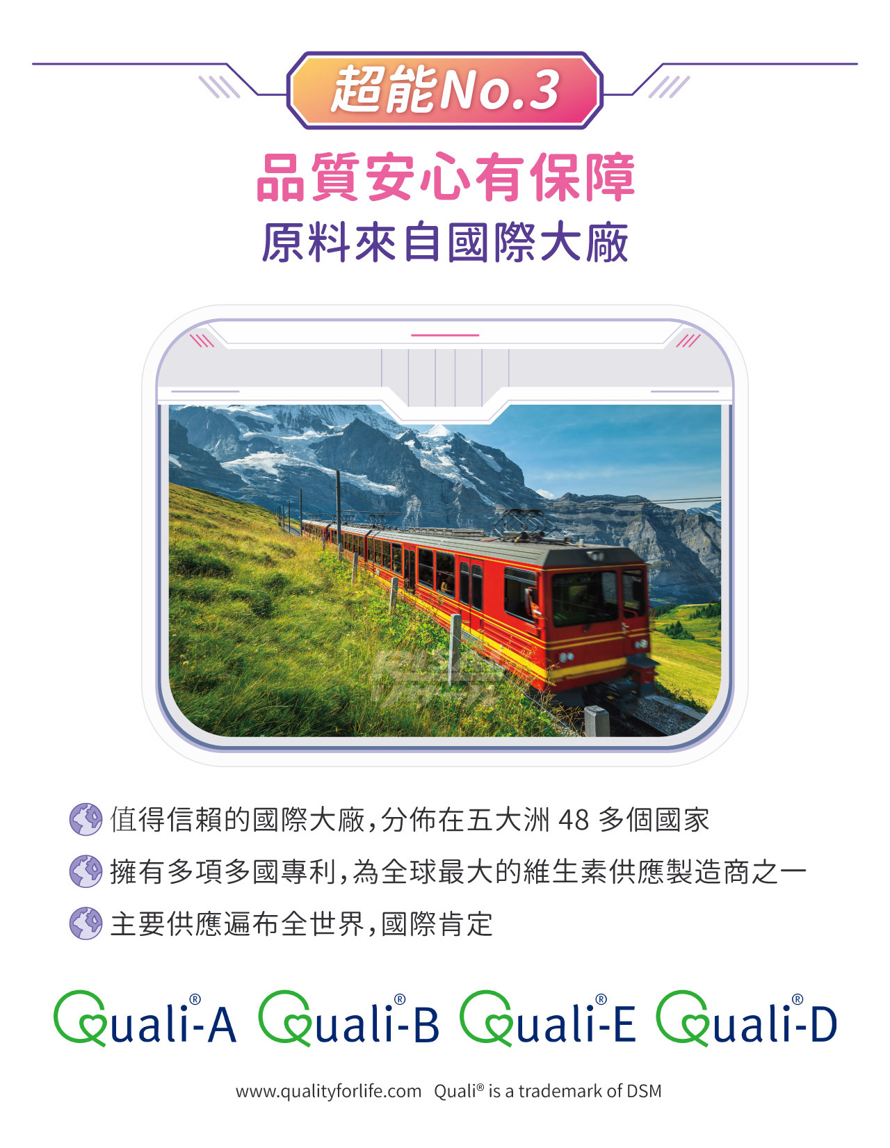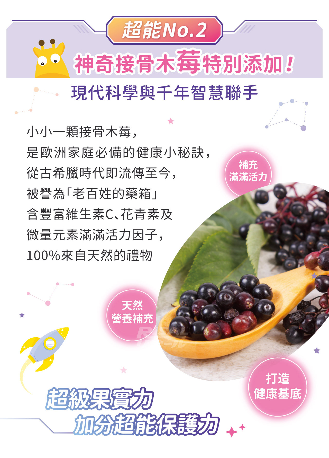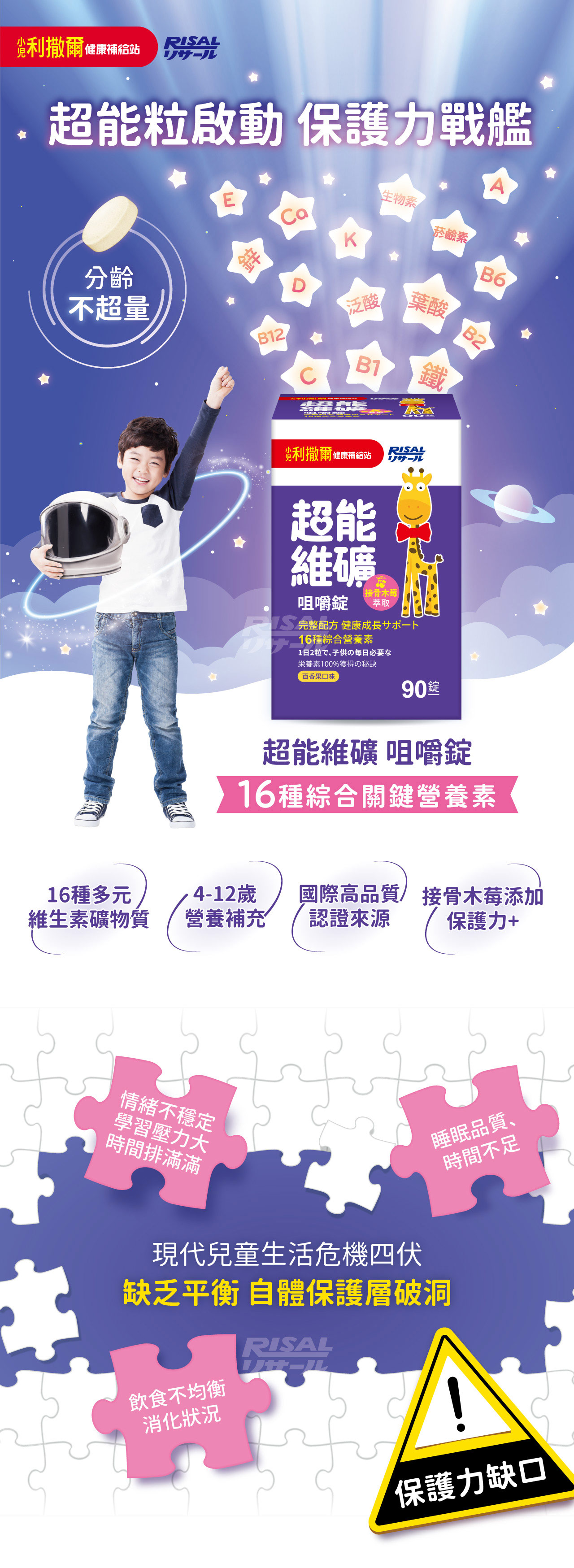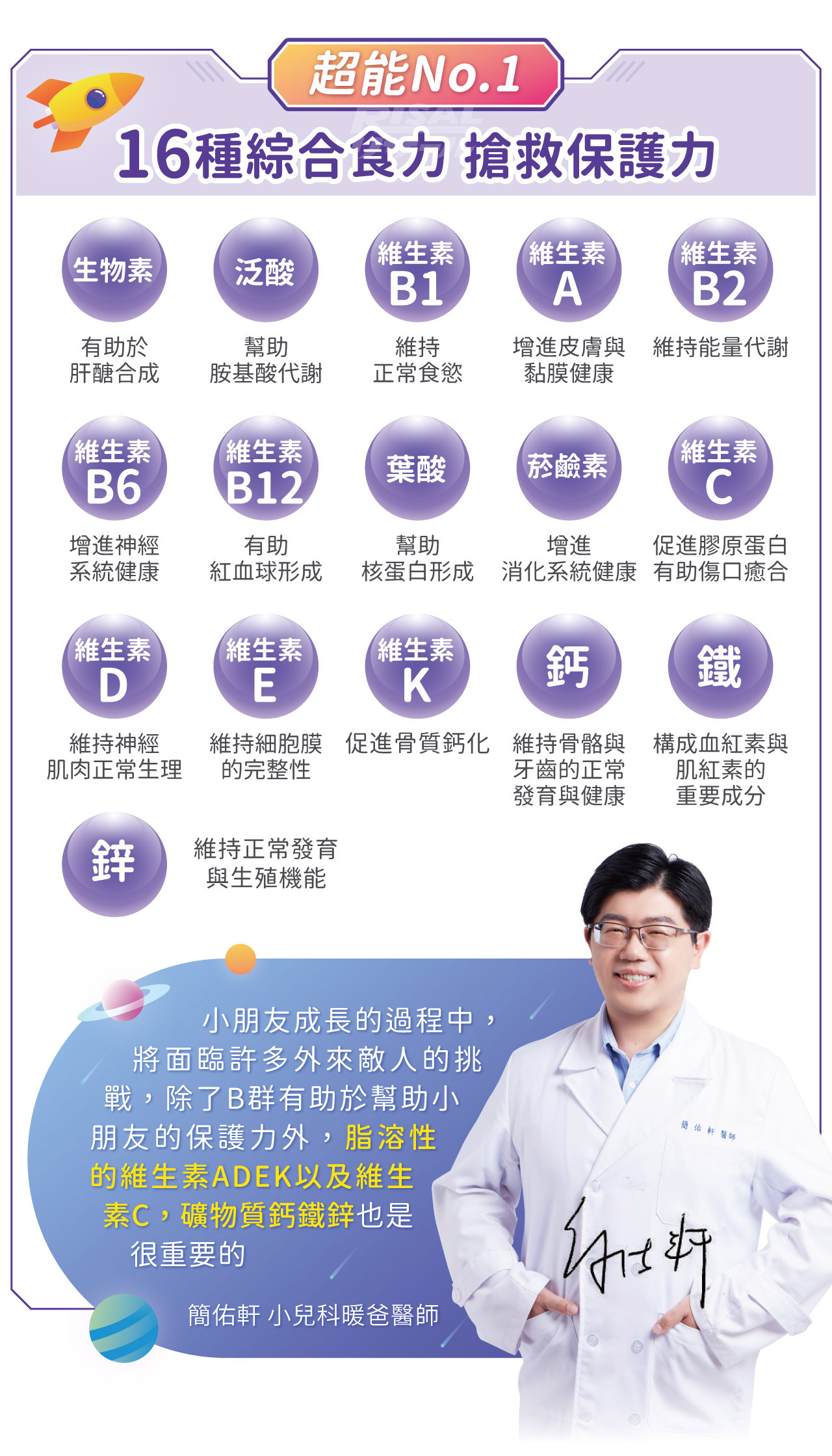 完整配方 健康成長サポート 16種綜合營養素˙完整16種營養力-補充兒童易忽略的綜合維生素礦物質攝取,滿足成長需求。˙強化體質機能力-添加接骨木莓萃取,調整體質強化機能。˙儲蓄健康支持力-選用國際大廠品質認證維生素原料,為健康扎實築底。˙全方位保護圈-每天1~2顆即可滿足一日所需,打造超能保護圈。