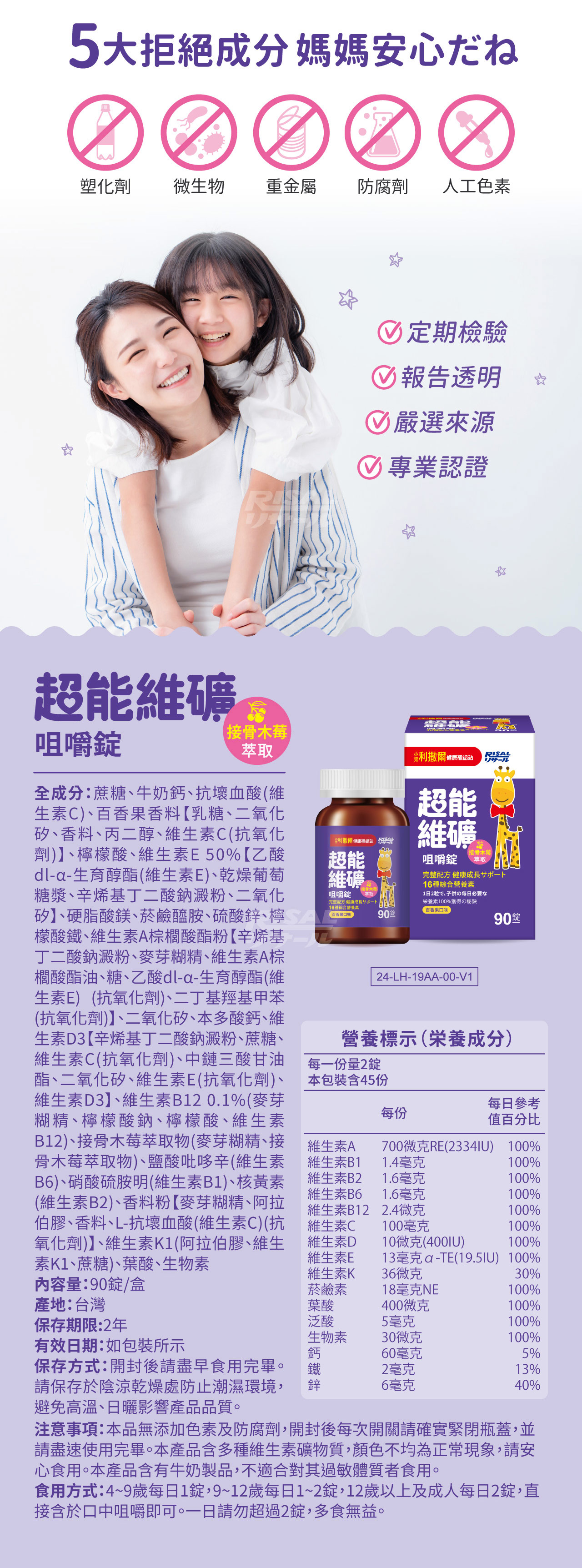 營養標示 每一份量2錠 本包裝含45份 每份 每日參考值百分比 維生素A 700 微克RE(2334IU) 100 % 維生素B1 1.4 毫克 100 % 維生素B2 1.6 毫克 100 % 維生素B6 1.6 毫克 100 % 維生素B12 2.4 微克 100 % 維生素C 100 毫克 100 % 維生素D 10 微克(400IU) 100 % 維生素E 13 毫克α-TE(19.5IU) 100 % 維生素K 36 微克 30 % 菸鹼素 18 毫克NE 100 % 葉酸 400 微克 100 % 泛酸 5 毫克 100 % 生物素 30 微克 100 % 鈣 60 毫克 5 % 鐵 2 毫克 13 % 鋅 6 毫克 40 %