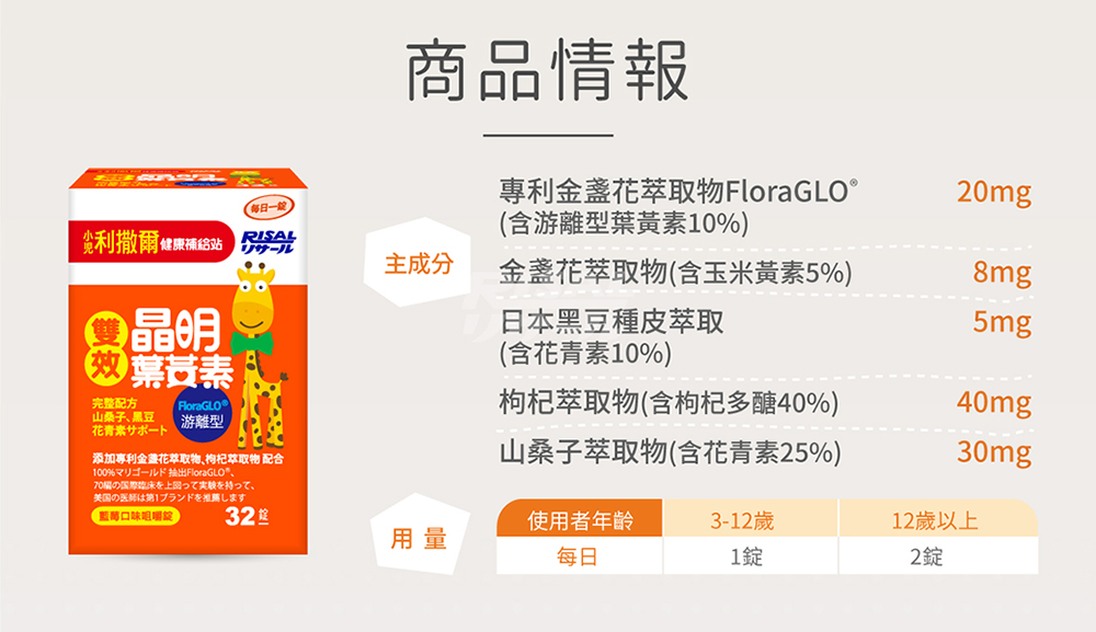 ●全成分:葡萄糖、乳糖、紅葡萄果汁粉(麥芽糊精、紅葡萄濃縮汁、阿拉伯膠)、藍莓果汁粉(藍莓濃縮汁、麥芽糊精)、枸杞萃取物(枸杞多醣40%)(枸杞萃取物、麥芽糊精)、山桑子萃取物(含花青素25%)、FloraGLO® 葉黃素10%(葉黃素、辛烯基丁二酸鈉澱粉、乾燥葡萄糖漿、蔗糖、L-抗壞血酸鈉(抗氧化劑))、硬脂酸鎂、金盞花萃取物(玉米黃素5%)(金盞花、麥芽糊精)、檸檬酸、黑大豆種皮萃取物(含10%花青素)、聚乙烯吡咯烷酮●內容量:32錠/盒●產地:台灣●保存期限:2年●保存方法:開封後請於1-2個月內食用完畢。請保存於30度c以下陰涼乾燥處或放入冰箱冷藏,避免高溫、日曬影響產品品質。●注意事項:山桑子萃取物本身為天然紫楬色,食用後舌頭略成紫褐色屬正常現象,請不用擔心●本產品含有牛奶、大豆及其製品,對其過敏者注意。