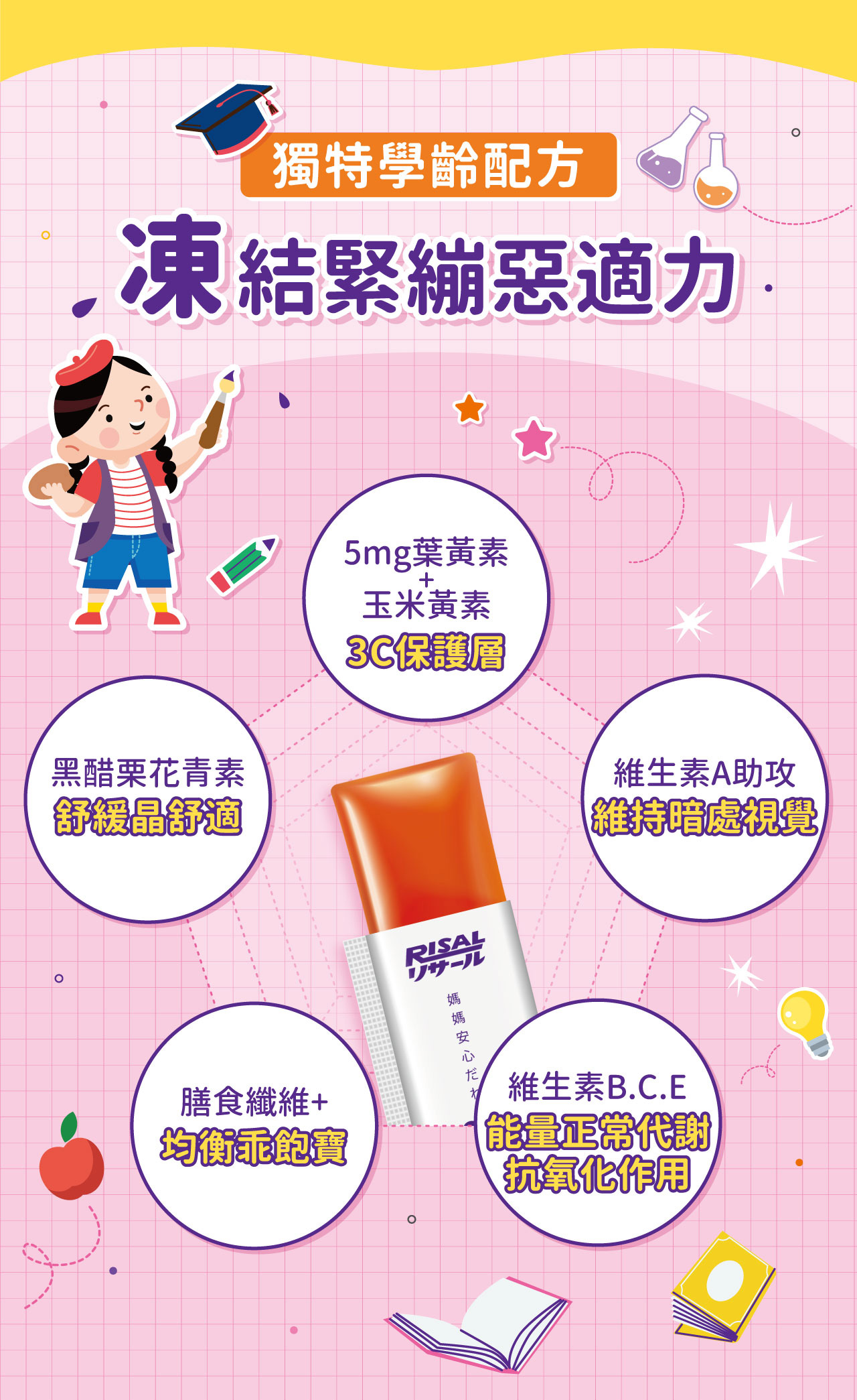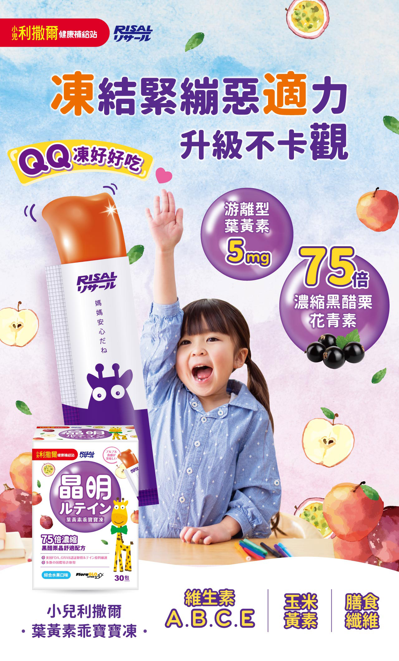 晶明保護˙雙游離型,黃金比例搭檔-葉黃素5mg:玉米黃素1mg晶適有神˙75倍濃縮黑醋栗-每包添加50mg,含D3R 及C3R型花青素˙添加Vit E具抗氧化作用均衡蔬果纖維果凍添加多種維生素及綜合蔬果濃縮汁-胡蘿蔔、鳳梨、柳橙、蘋果、芹菜、百香果、香蕉、芒果、木瓜、檸檬木醣醇+水溶性膳食纖維 550mg *無額外添加砂糖、色素、防腐劑