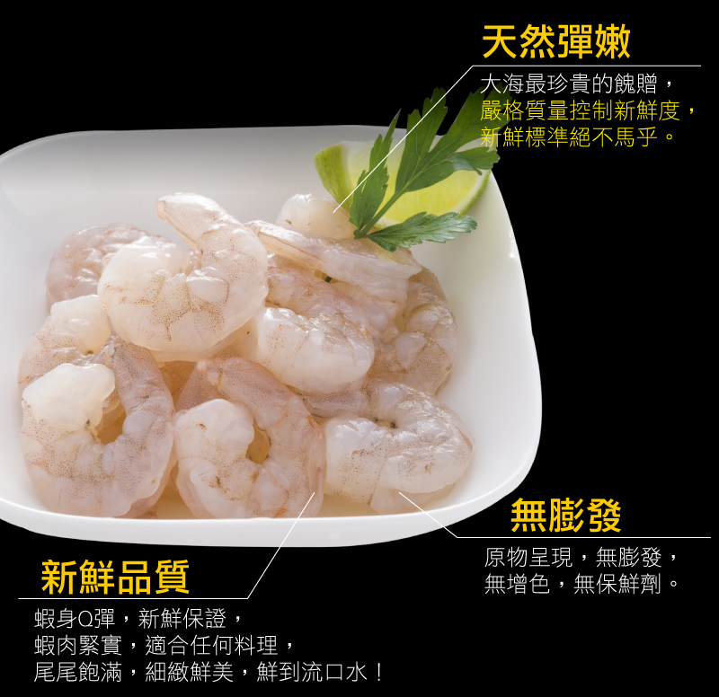 保存方式 冷凍-18℃以下食用方式 各式料理內容物成份 蝦仁,檸檬酸,檸檬酸鈉,碳酸氫鈉熱量 可免標示每份營養成份 可免標示內容量 ( g/ml ) 200G±10%/包/包冰25%食品添加物名稱 無產地(國家或台灣縣市) 越南廠商名稱 豪鮮食品廠商電話號碼 07-3650350廠商地址 高雄市大社區旗楠路88號保存期限 如包裝所示投保產品責任險字號 1300-04AKP0000486食品業者登錄字號 E-183128073-00000-4