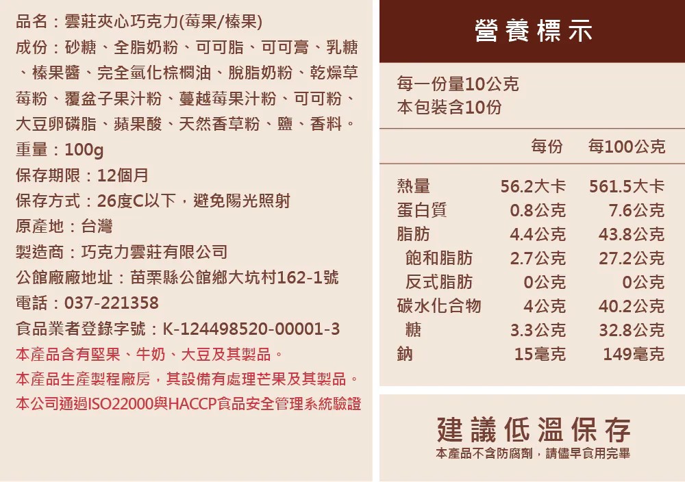 砂糖、全脂奶粉、可可脂、可可膏、乳糖、榛果醬、完全氫化棕櫚油、脫脂奶粉、乾燥草莓粉、覆盆子果汁粉、蔓越莓果汁粉、可可粉、大豆卵磷脂、蘋果酸、天然香草粉、鹽、香料。