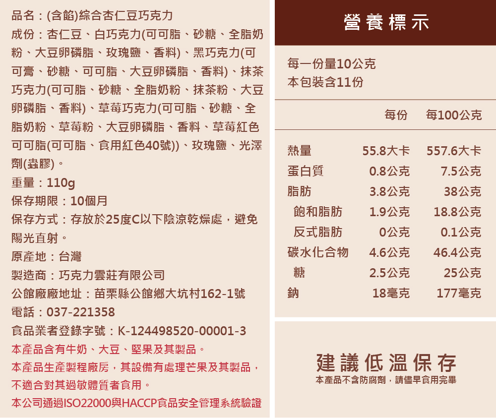 白巧克力杏仁豆-杏仁豆、可可脂、砂糖、乳糖、全脂奶粉、脫脂奶粉、玫瑰鹽、大豆卵磷脂、光澤劑(蟲膠)、香料。 70%玫瑰鹽巧克力杏仁豆-可可膏、杏仁豆、蔗糖、可可脂、大豆卵磷脂、光澤劑(蟲膠)、玫瑰鹽、天然香草。 抹茶巧克力杏仁豆-杏仁豆、可可脂、砂糖、乳糖、全脂奶粉、脫脂奶粉、抹茶粉、綠茶粉、玫瑰鹽、大豆卵磷脂、香料、光澤劑(蟲膠)。 草莓巧克力杏仁豆-草莓巧克力(可可脂、砂糖、全脂奶粉、草莓粉、大豆卵磷脂、香料、草莓紅可可脂(可可脂、食用紅色40號))、杏仁豆、光澤劑(蟲膠)。