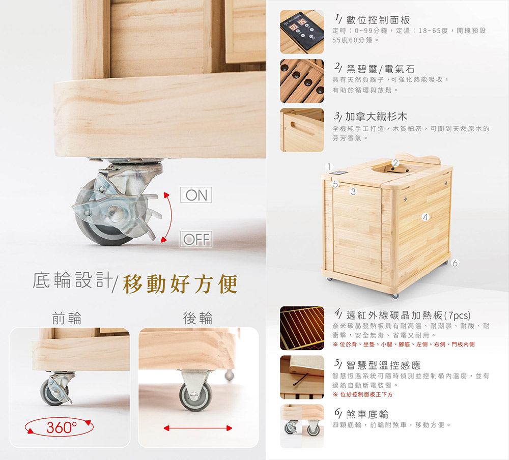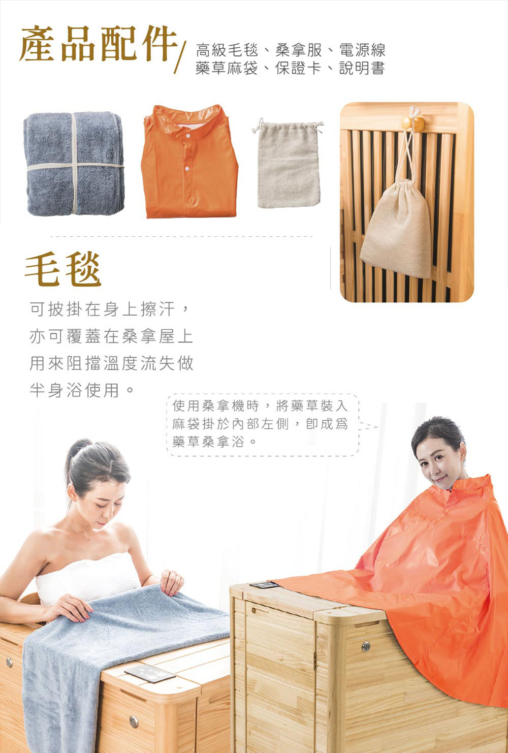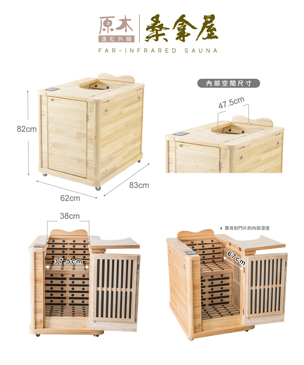 반신욕 사우나★獨家專利★ 頂 級 御 用 款■全身/半身,兩用式 原木桑拿屋■免組裝,附煞車底輪,好移動,隨開即用■嚴選加拿大鐵杉木100%手工打造■數位控制面板,可定溫定時■智慧恆溫系統,18-65度可調整■7片遠紅外線碳晶加熱板,加熱速度快■5個金屬散熱孔,過熱自動斷電系統■112顆養生黑碧璽,釋放微弱電流及溫熱能量■工研院遠紅外線測試,放射率達93.4%■5000萬產品責任險■附贈:高級毛毯、桑拿服、藥草包x2、藥草麻袋、說明書、保證卡◎貼心提醒◎ 本產品尺寸較大(寬62x深83x高82cm),請先量妥家中擺放位置的長寬高後,再購買。本產品屬於親膚接觸的衛生品關係(注意!網購猶豫期非試用期)辦理退貨商品必須是"全新未拆封膜狀態"且"包裝完整",否則將會影響退貨權限。