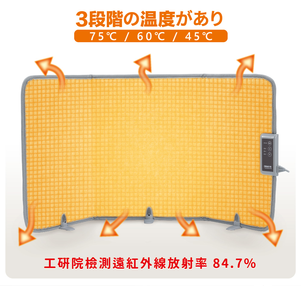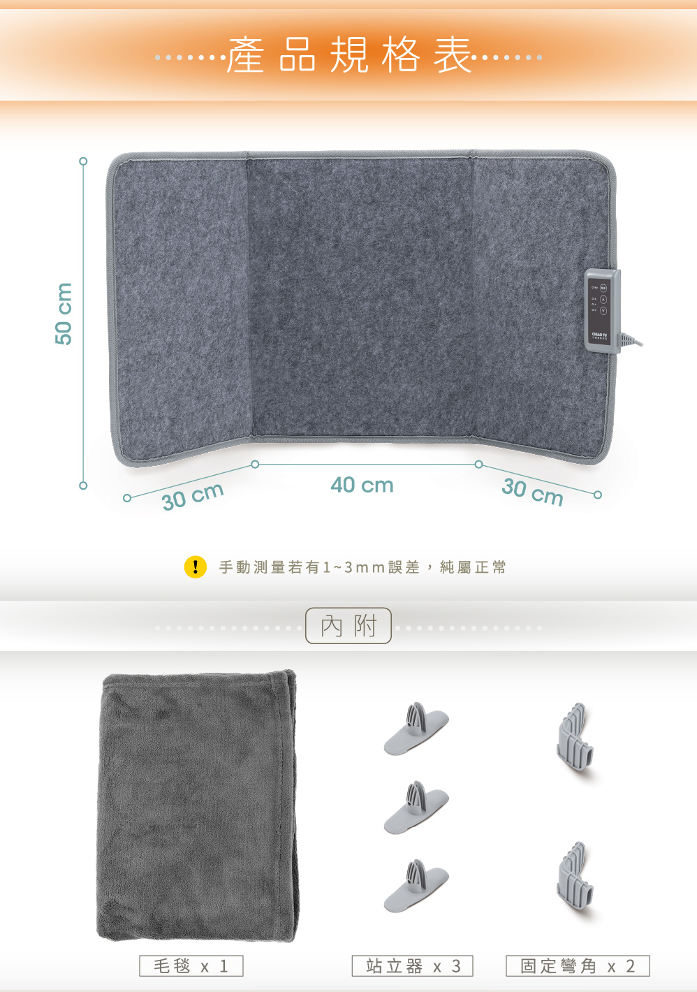 遠紅外線、速暖、保暖■ 速暖,30秒快速加熱■ 無補充,免耗材、免燃料■ 省電、無味、靜音、不耗氧■ 摺疊收納,不佔空間■ 強、中、弱三段溫度調整■ 傾倒自動斷電裝置■ 外側阻熱防燙設計■ 3小時自動斷電裝置■ 數位恆溫裝置■ 遠紅外線碳晶發熱板■ 面板及發熱體採耐燃材質■ 高溫款可達75度■ 附贈毛毯x1、固定彎角x2、站立器x3■工研院遠紅外線測試,放射率達84.7%■ 經濟部標準檢驗局檢驗合格R51286■ 5000萬產品責任險■ 保固期:1年保固本產品屬於衛生品關係(注意!猶豫期非試用期),辦理退貨商品必須是全新狀態且包裝完整,否則將會影響退貨權益。