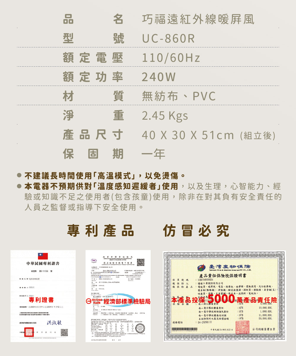 【巧福】遠紅外線暖屏風 三折高溫款 UC-860R (保暖/電暖)