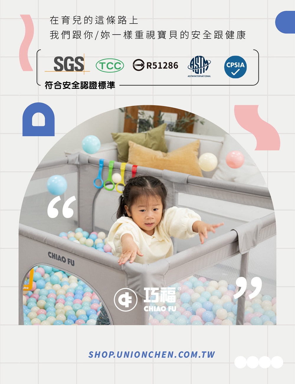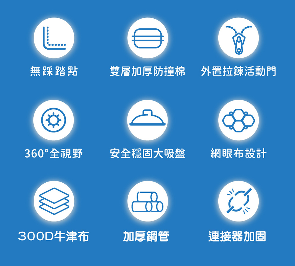 ■升級版的高韌性強化連接器■360°全透視安全網,看顧寶貝無死角■一體式設計,無隙縫、無踩踏點■加厚不銹鋼管搭配加大吸盤,安全穩固■包裹式加厚防撞棉,避免寶貝碰撞受傷■300D牛津布,舒適透氣網眼材質,耐磨易清潔■外置型拉鍊小網門,可自由掌控寶貝出入■組立後實體尺寸:157x187x68 cm■0歲即可使用,可用到5歲以上■符合美國 ASTM、CPSIA、SGS檢驗標準■台灣ST玩具認證檢驗合格■經濟部標準檢驗局檢驗合格 R51286■5000萬產品責任險