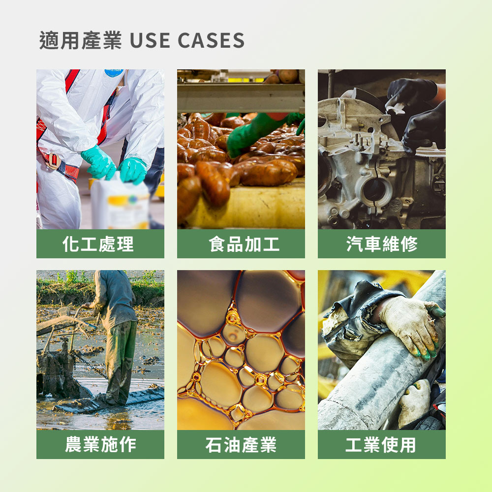 專為化學作業、食品加工、汽車維修、農業與各類油脂溶劑接觸環境設計。