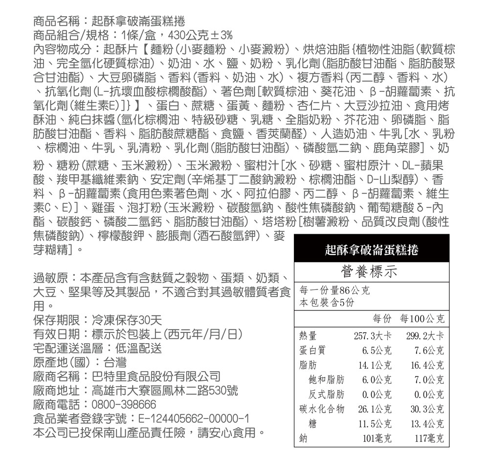 【巴特里】杏仁起酥拿破崙蛋糕 4入組 贈蔥餐包1盒