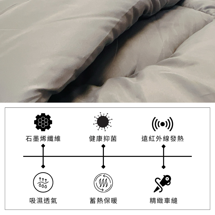 ◼利用石墨烯纖維特性,與人體的熱能轉換讓身體和棉被不斷進行熱循環。