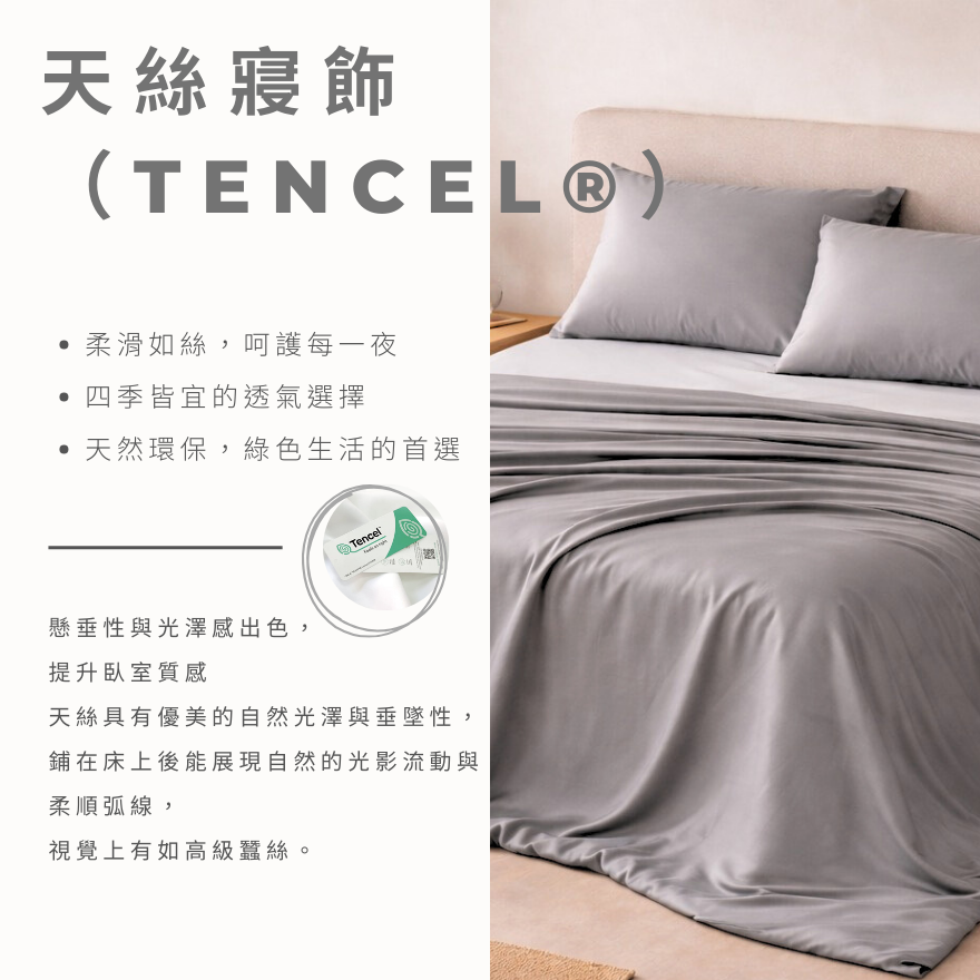 ・100%天絲™Lyocell,親膚無毒,環保永續