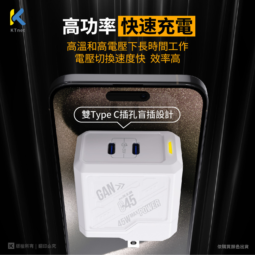 【KTNET】G45氮化鎵2C 機甲45W全電壓充電器 白