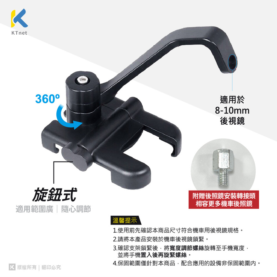 特色:◆適合手機寬度60~100mm,厚度(含保護殼)10~10.5mm◆適用8-10mm的機車後視鏡◆旋鈕式後視鏡專用支架,拆裝方便◆12種角度,360度水平翻轉,穩如泰山,定格鎖榫超穩固◆U型卡槽,四爪溝槽夾榫,不易甩機◆全鋁合金材質,風吹日曬較不易脆化斷裂商品規格:產品尺寸 : 73*130*90mm產品重量 : 223g±5g產地 : 中國材質 : 鋁合金包裝尺寸 : 160*110*80mm包裝內容 : 機車支架*1.墊片1組溫馨提示:騎行中操作手機屬於危險駕駛,請注意安全本產品一年保固:新品七天換貨 / 保修一年※請注意!產品因非人為故障必須更換新品需知(1)購買七日內發生故障,可憑發票及購買憑證就原購買地換新(2)外觀請維持良好無刮傷與無髒污注意事項1.使用前先確認本商品尺寸符合機車用後視鏡規格。2.請將本產品安裝於機車後視鏡鎖緊。3.確認支架鎖緊後,將寬度調節螺絲旋轉至手機寬度,並將手機置入後再旋緊螺絲。4.保護範圍僅針對本商品,配合應用的設備非保固內。(3)包裝完整及商品配件齊全