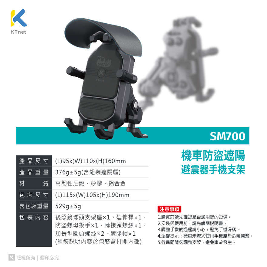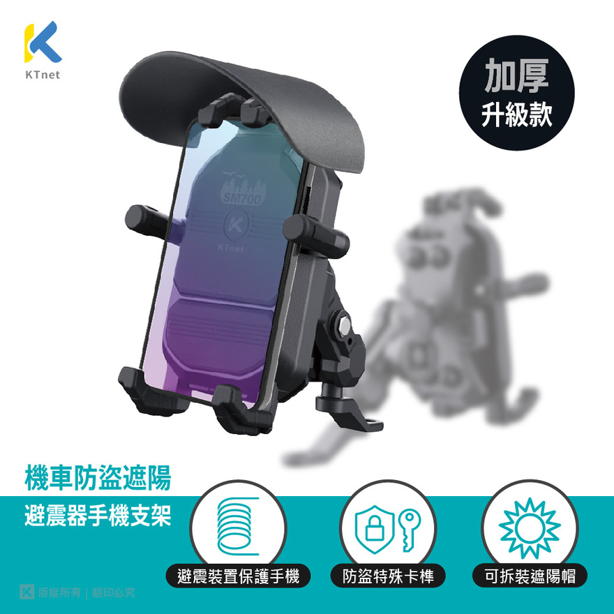 【KTNET】SM700 機車防盜遮陽避震器手機支架 後照鏡款