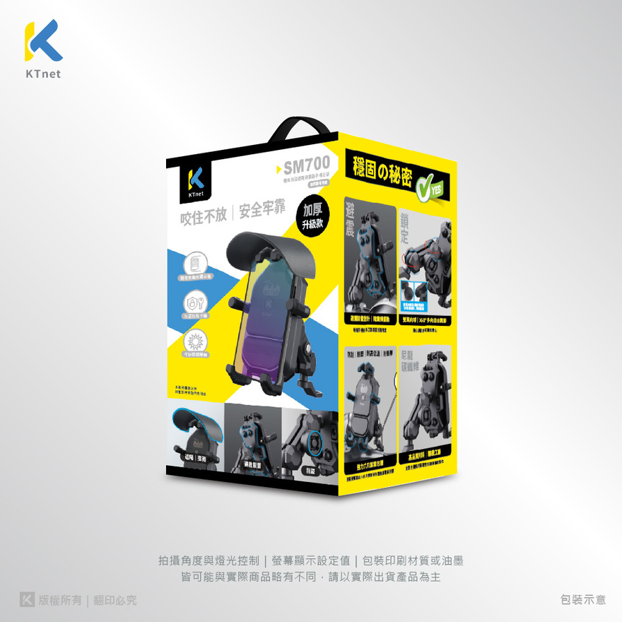 特色:※支架主體採用高韌性尼龍纖維製作,包覆無毒環保矽膠※設備接觸面及六爪矽膠套為防刮.耐磨.耐高低溫.耐衝擊的材質特性※單手放置/移除手機:單手快速推上勾爪彈即可輕鬆將手機就定位鎖及輕鬆移除※減震裝置設計 透過震頻器以承載300g及每次100分鐘近6000震次的頻率測試,避免手機在非正常路面的耐用度※防盜鑰匙圈扣設計 支架固定板手即為防盜螺母板手,可當鑰匙扣隨身攜帶防止手機支架被盜※遮陽帽附加設計 遮陽帽簡易安裝,可遮蔽陽光直接曝曬手機及防潑水※萬向球及球座3D蜂巢設計: 萬向球3D蜂巢式母座及延伸桿球座內的公座的緊密結合設計不易因震動 更改手機可視角度,雙萬向球設計,可360度隨時自由調整角度※厚板手機殼的最佳選擇:15mm以下厚度的手機保護殼仍可以優雅放,更加人性化※手機適用尺寸:高度:130~175mm 寬度:72~90mm 厚度:15mm以下適用車種:摩托車.管車.電動車.自行車本產品一年保固:新品七天換貨 / 保修一年※請注意!產品因非人為故障必須更換新品需知 (1)購買七日內發生故障,可憑發票及購買憑證就原購買地換新 (2)外觀請維持良好無刮傷與無髒污 (3)包裝完整及商品配件齊全