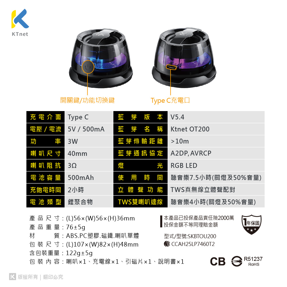產品尺寸 : (L)56×(W)56×(H)36mm產品重量 : 76g±5g含包裝重量 : 122g±5g產 地 : 中國材 質 : ABS.PC塑膠.磁鐵.喇叭單體包裝尺寸 : (L)107×(W)82×(H)48mm包裝內容 : 喇叭×1、充電線×1、引磁片×1、說明書×1
