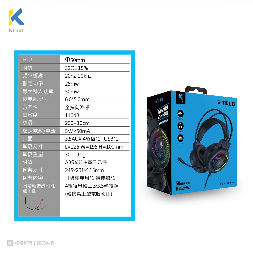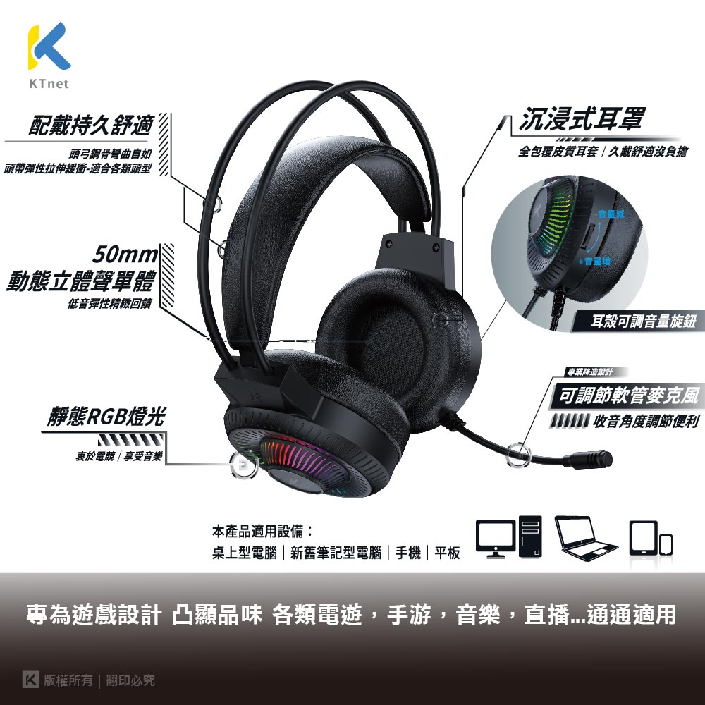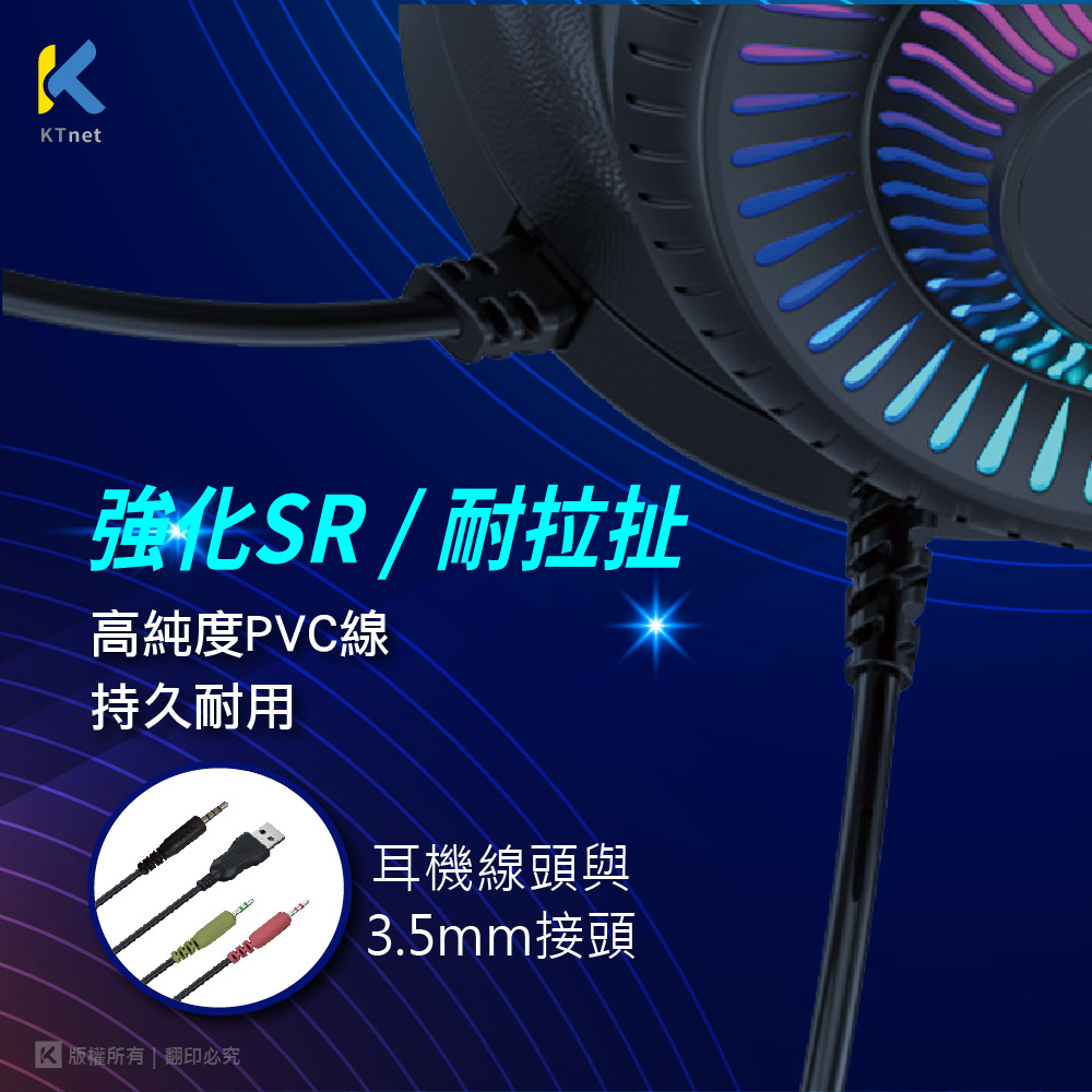 【KTNET】GM1000全罩式電競LED耳機麥克風 4極插+3.5x2