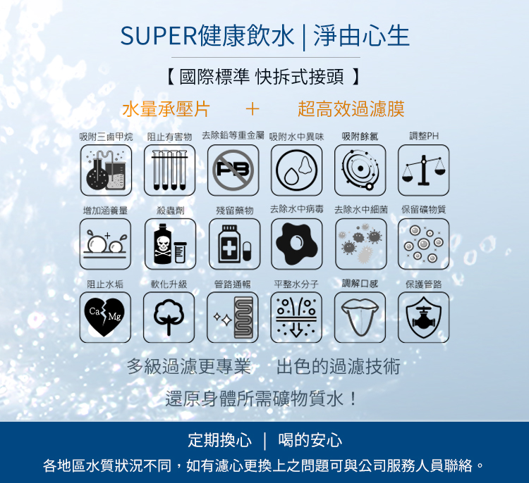 濾材一旦過水使用,即開始過濾水中各種雜質或汙染物,若超過建議更換時間未予更換,將無法確保過濾品質,嚴重將成為細菌溫床,反讓濾水系統汙染。為確保您飲水衛生安全,請定期更換濾心。