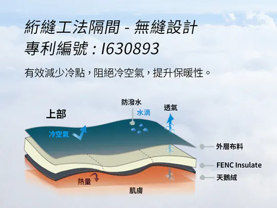 【填充物】FENC® Insulate 仿羽絨纖維運用仿生學,透過三維螺旋狀超細短纖維打造溫暖的空氣絕熱層,兼具高彈性、高膨脹度、良好絕熱性與可壓縮性。輕量柔軟,觸感極佳,帶來卓越體驗。