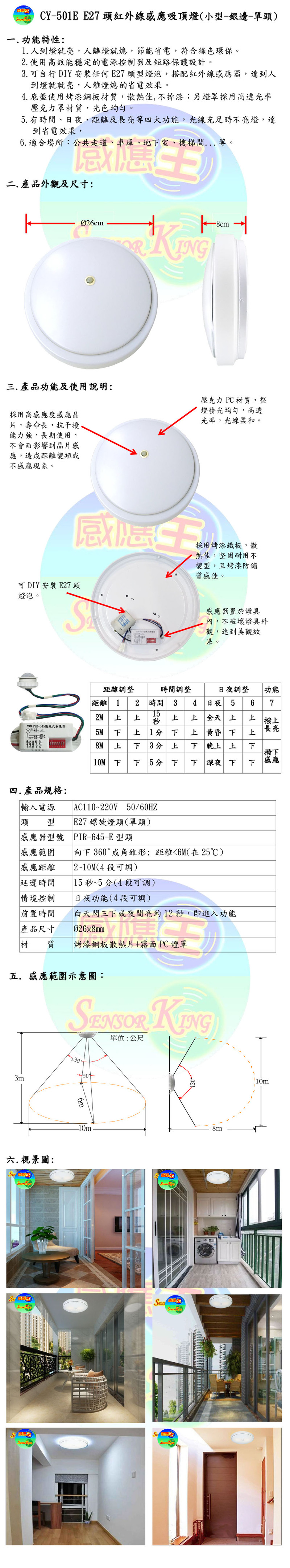 【感應王】CY-501E E27頭紅外線感應吸頂燈(單頭-全電壓) 可調日夜,距離及時間