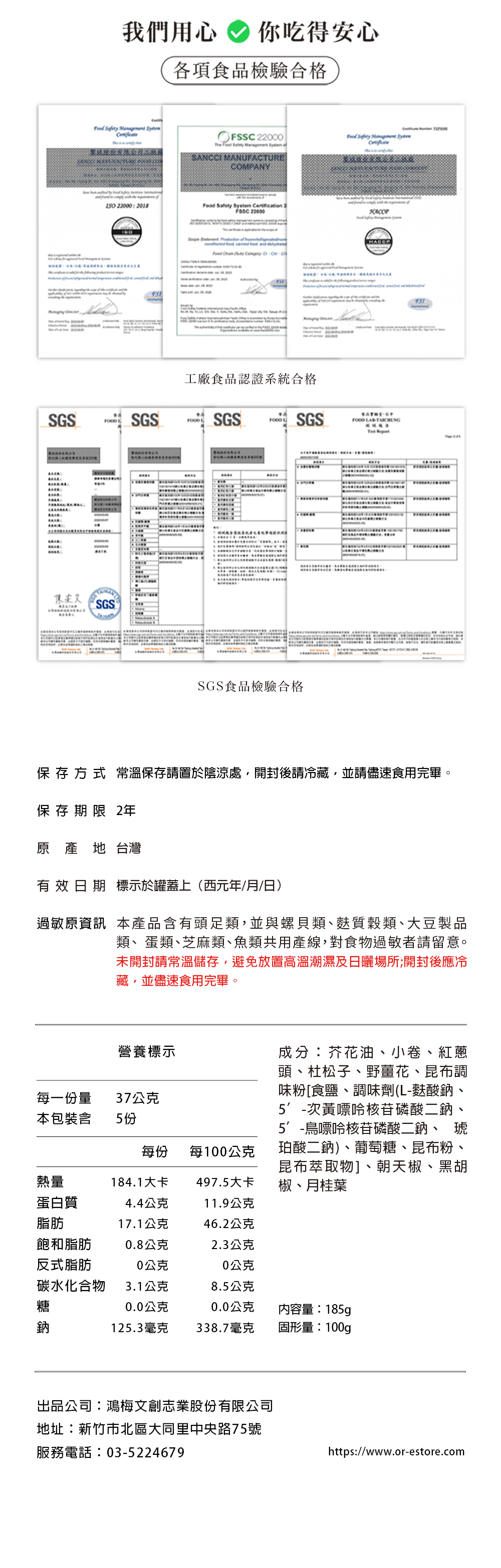 營養標示 每一份量37公克 本包裝含5份 每份 每100公克 熱量 192.3 大卡 519.7大卡 蛋白質 3.5公克 9.4公克 脂肪 18.7公克 50.5公克 飽和脂肪 1.4公克 3.9公克 反式脂肪 0公克 0公克 碳水化合物 2.6公克 6.9公克 糖 0.3公克 0.9公克 鈉 228.2毫克 616.7毫克