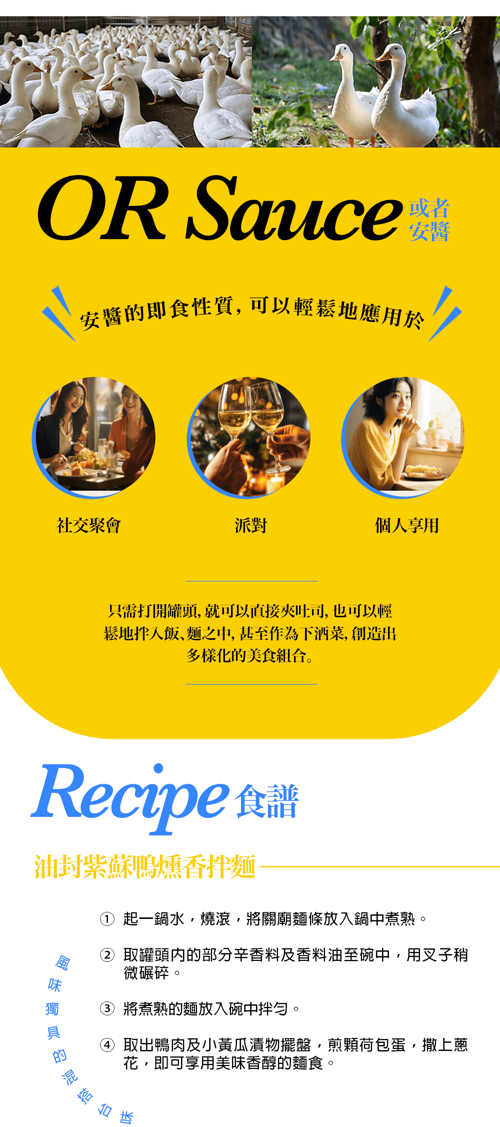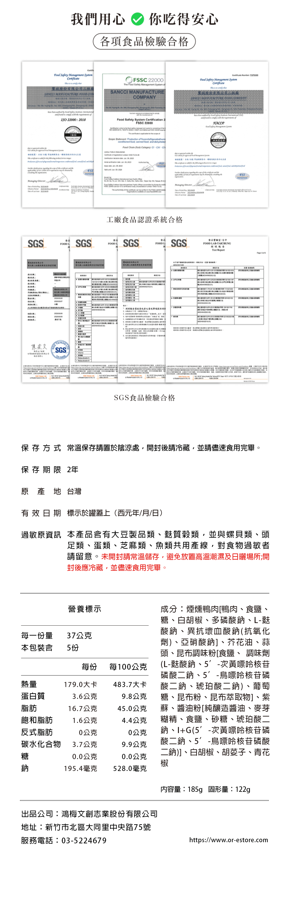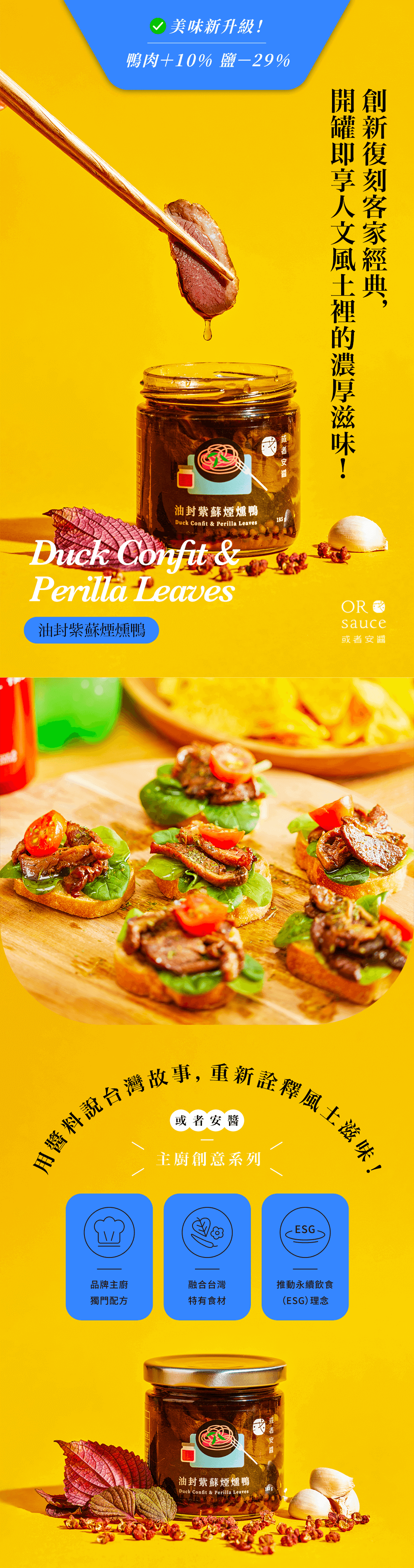 🎉風味新升級!鴨肉增量 10% 加量不加價!減鹽 29% 更健康採用法式油封手法將「人道飼育認證」鴨肉與客家紅紫蘇的裊裊燻香封存進油脂中,一點一滴都貴的台灣味。延續或者品牌精神「讓在地人驕傲、旅行者憧憬」所展開的五感閱讀,透過食材選擇、食物設計,打造讓人驚喜的醬料,同時推動永續飲食理念!●規格:185g 固形物:110g●特色食材:煙燻鴨腿、紫蘇葉●保存期限:2年●保存方式:未開封請常溫保存,避免高溫潮濕及日曬場所;開封後冷藏,並儘速食用完畢。●原產地:台灣