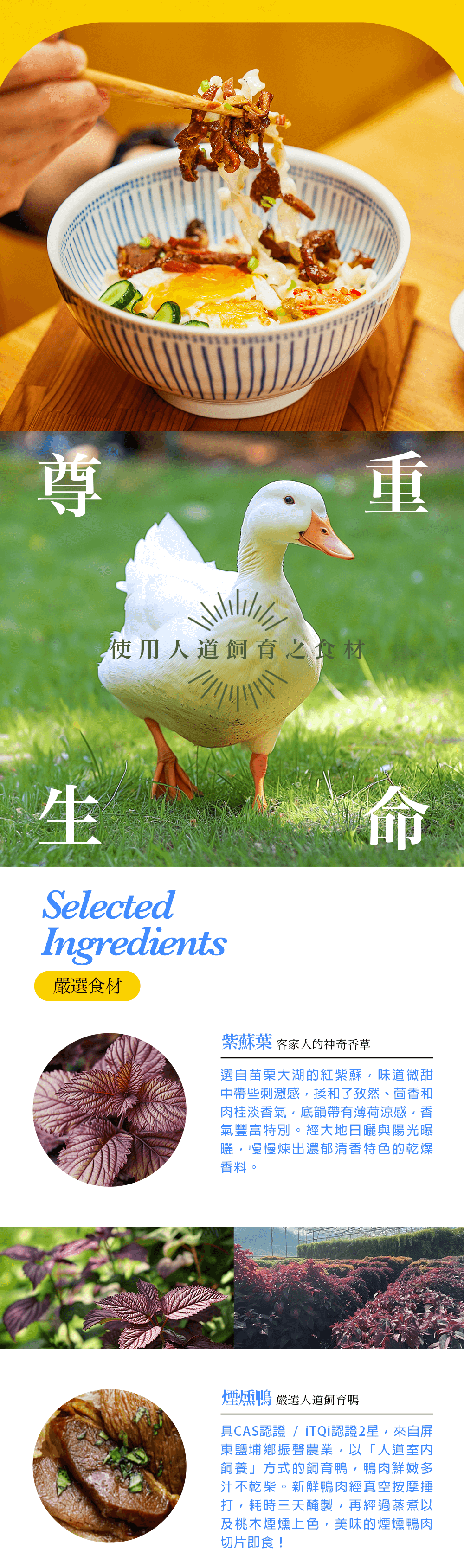 煙燻鴨腿[鴨肉、食鹽、糖、白胡椒、多磷酸鈉、L-麩酸鈉、異抗壞血酸鈉(抗氧化劑)、亞硝酸鈉]、芥花油、蒜頭、紫蘇、昆布調味粉[食鹽、調味劑(L-麩酸鈉、5’-次黃嘌呤核苷磷酸二鈉、5’-鳥嘌呤核苷磷酸二鈉、琥珀酸二鈉)、葡萄糖、昆布粉、昆布萃取物]、醬油粉[純釀造醬油、麥芽糊精、食鹽、砂糖、琥珀酸二鈉、I+G(5’-次黃嘌呤核苷磷酸二鈉、5’-鳥嘌呤核苷磷酸二鈉)]、白胡椒、海鹽、胡荽子、青花椒