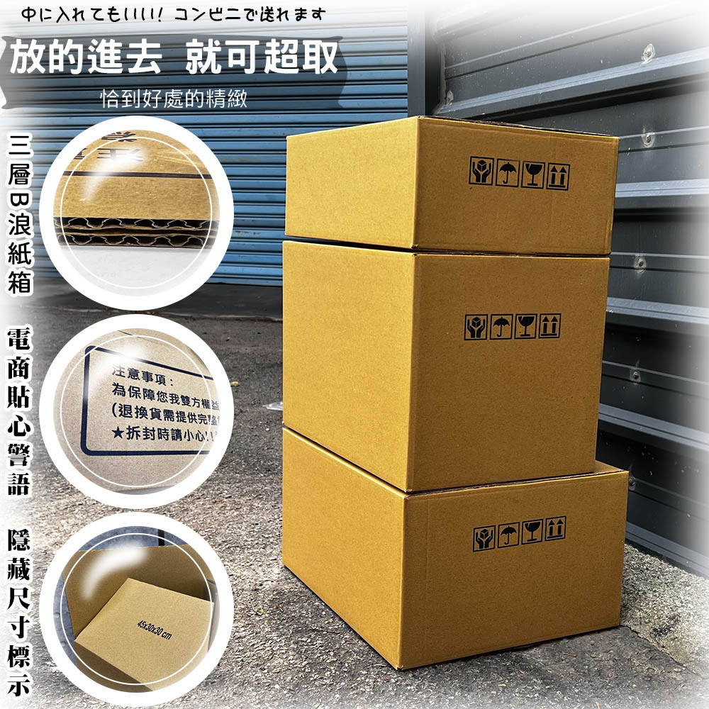 材質:三層B浪紙材 規格:1號-45 x 36 x 23 x 紙箱厚度0.3CM(手工測量±1CM) 規格:2號-45 x 30 x 30 x 紙箱厚度0.3CM (手工測量±1CM) 規格:3號-45 x 30 x 15 x 紙箱厚度0.3CM (手工測量±1CM) 是否需要組裝:是 產地:台灣製造