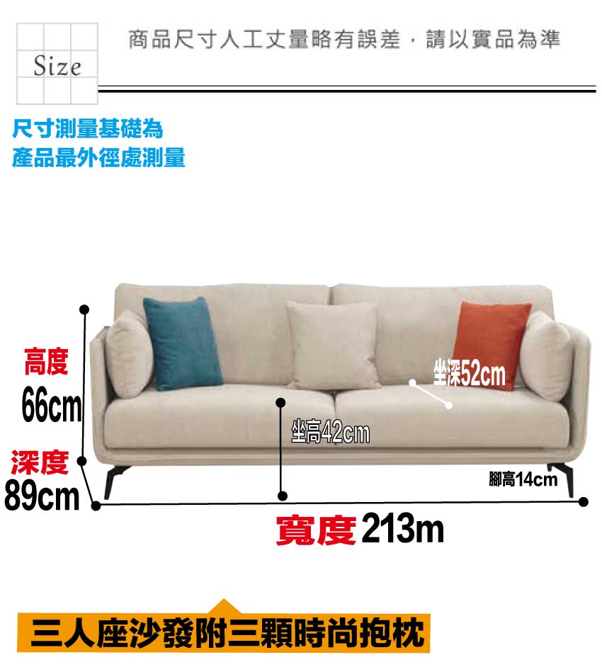 3人座尺寸:(寬)213x(深)89x(高)66/公分